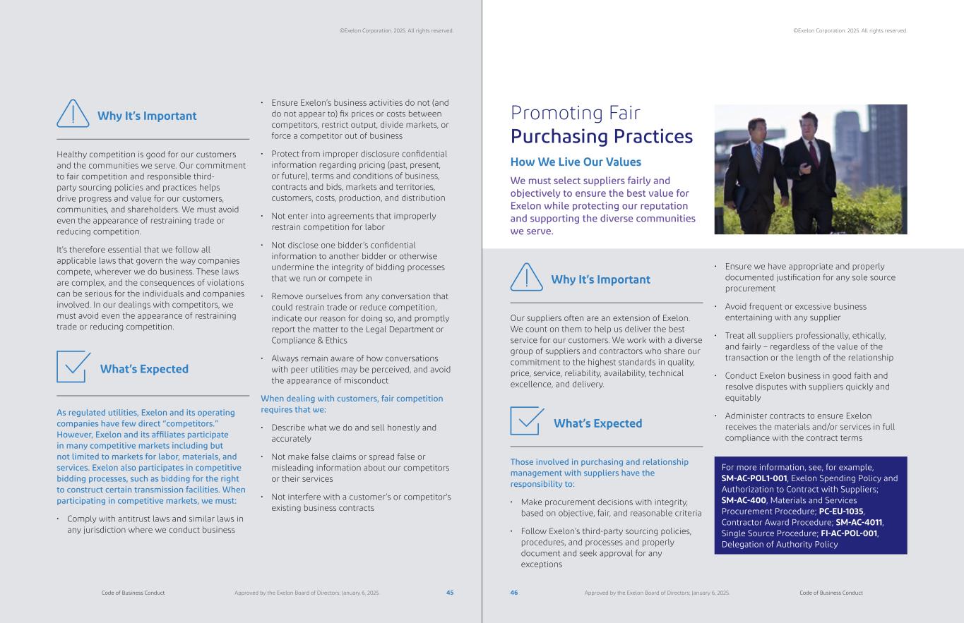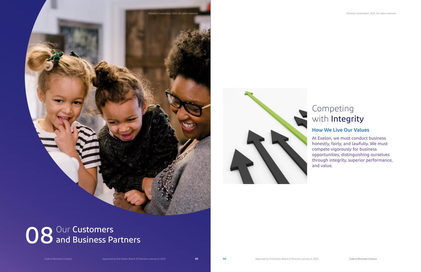 Our Customers and Business Partners08 Competing with Integrity At Exelon, we must conduct business honestly, fairly, and lawfully. We must compete vigorously for business opportunities, distinguishing ourselves through integrity, superior performance, and value. How We Live Our Values ©Exelon Corporation. 2025. All rights reserved. ©Exelon Corporation. 2025. All rights reserved. 43 44Code of Business Conduct Code of Business ConductApproved by the Exelon Board of Directors; January 6, 2025. Approved by the Exelon Board of Directors; January 6, 2025.