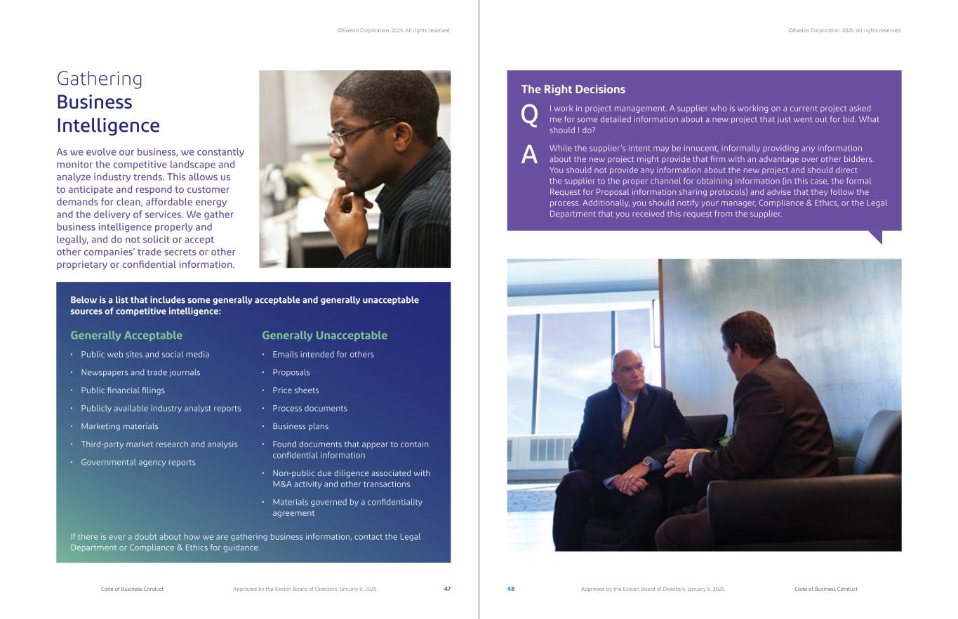 Gathering Business Intelligence As we evolve our business, we constantly monitor the competitive landscape and analyze industry trends. This allows us to anticipate and respond to customer demands for clean, affordable energy and the delivery of services. We gather business intelligence properly and legally, and do not solicit or accept other companies’ trade secrets or other proprietary or confidential information. Below is a list that includes some generally acceptable and generally unacceptable sources of competitive intelligence: If there is ever a doubt about how we are gathering business information, contact the Legal Department or Compliance & Ethics for guidance. Generally Acceptable • Public web sites and social media • Newspapers and trade journals • Public financial filings • Publicly available industry analyst reports • Marketing materials • Third-party market research and analysis • Governmental agency reports Generally Unacceptable • Emails intended for others • Proposals • Price sheets • Process documents • Business plans • Found documents that appear to contain confidential information • Non-public due diligence associated with M&A activity and other transactions • Materials governed by a confidentiality agreement The Right Decisions I work in project management. A supplier who is working on a current project asked me for some detailed information about a new project that just went out for bid. What should I do? While the supplier’s intent may be innocent, informally providing any information about the new project might provide that firm with an advantage over other bidders. You should not provide any information about the new project and should direct the supplier to the proper channel for obtaining information (in this case, the formal Request for Proposal information sharing protocols) and advise that they follow the process. Additionally, you should notify your manager, Compliance & Ethics, or the Legal Department that you received this request from the supplier. A Q 47 48Code of Business Conduct Code of Business ConductApproved by the Exelon Board of Directors; January 6, 2025. Approved by the Exelon Board of Directors; January 6, 2025. ©Exelon Corporation. 2025. All rights reserved. ©Exelon Corporation. 2025. All rights reserved.