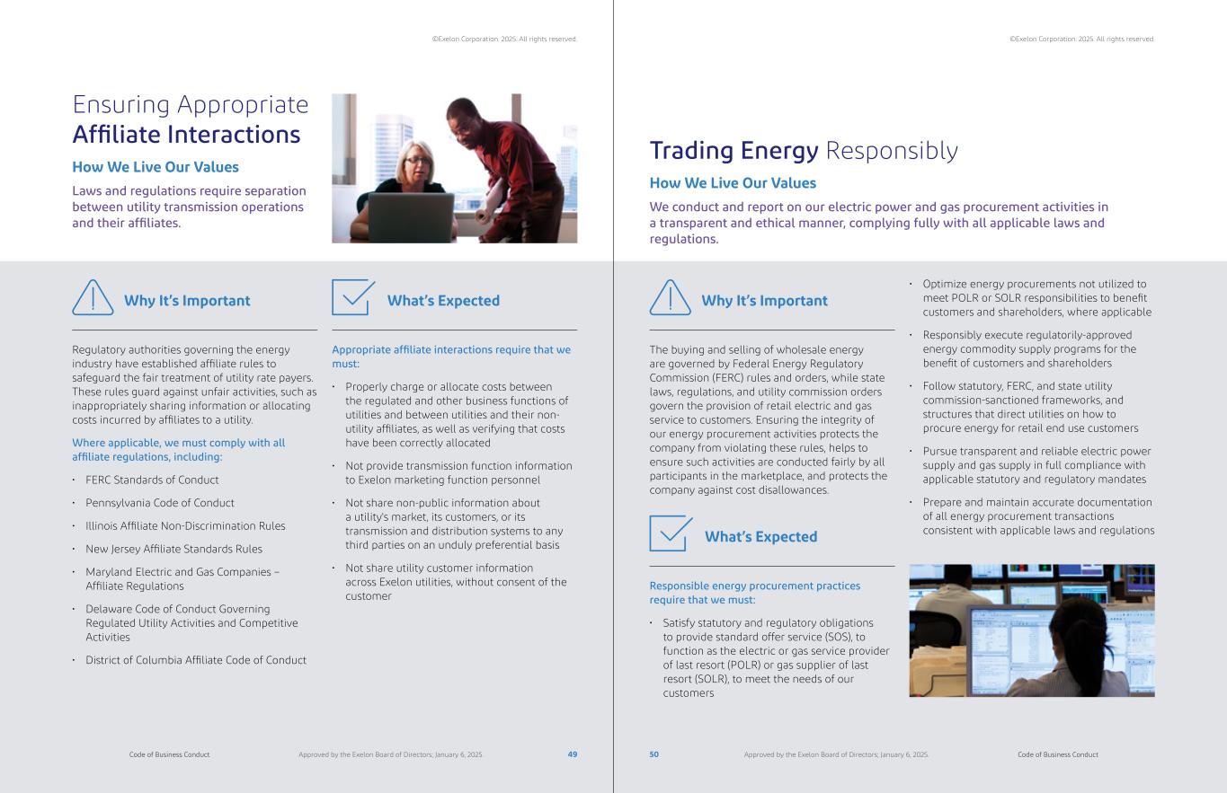 Ensuring Appropriate Affiliate Interactions Trading Energy Responsibly Laws and regulations require separation between utility transmission operations and their affiliates. We conduct and report on our electric power and gas procurement activities in a transparent and ethical manner, complying fully with all applicable laws and regulations. How We Live Our Values How We Live Our Values Regulatory authorities governing the energy industry have established affiliate rules to safeguard the fair treatment of utility rate payers. These rules guard against unfair activities, such as inappropriately sharing information or allocating costs incurred by affiliates to a utility. Where applicable, we must comply with all affiliate regulations, including: • FERC Standards of Conduct • Pennsylvania Code of Conduct • Illinois Affiliate Non-Discrimination Rules • New Jersey Affiliate Standards Rules • Maryland Electric and Gas Companies – Affiliate Regulations • Delaware Code of Conduct Governing Regulated Utility Activities and Competitive Activities • District of Columbia Affiliate Code of Conduct The buying and selling of wholesale energy are governed by Federal Energy Regulatory Commission (FERC) rules and orders, while state laws, regulations, and utility commission orders govern the provision of retail electric and gas service to customers. Ensuring the integrity of our energy procurement activities protects the company from violating these rules, helps to ensure such activities are conducted fairly by all participants in the marketplace, and protects the company against cost disallowances. Why It’s Important Why It’s Important Appropriate affiliate interactions require that we must: • Properly charge or allocate costs between the regulated and other business functions of utilities and between utilities and their non- utility affiliates, as well as verifying that costs have been correctly allocated • Not provide transmission function information to Exelon marketing function personnel • Not share non-public information about a utility's market, its customers, or its transmission and distribution systems to any third parties on an unduly preferential basis • Not share utility customer information across Exelon utilities, without consent of the customer Responsible energy procurement practices require that we must: • Satisfy statutory and regulatory obligations to provide standard offer service (SOS), to function as the electric or gas service provider of last resort (POLR) or gas supplier of last resort (SOLR), to meet the needs of our customers What’s Expected What’s Expected • Optimize energy procurements not utilized to meet POLR or SOLR responsibilities to benefit customers and shareholders, where applicable • Responsibly execute regulatorily-approved energy commodity supply programs for the benefit of customers and shareholders • Follow statutory, FERC, and state utility commission-sanctioned frameworks, and structures that direct utilities on how to procure energy for retail end use customers • Pursue transparent and reliable electric power supply and gas supply in full compliance with applicable statutory and regulatory mandates • Prepare and maintain accurate documentation of all energy procurement transactions consistent with applicable laws and regulations 49 50Code of Business Conduct Code of Business ConductApproved by the Exelon Board of Directors; January 6, 2025. Approved by the Exelon Board of Directors; January 6, 2025. ©Exelon Corporation. 2025. All rights reserved. ©Exelon Corporation. 2025. All rights reserved.
