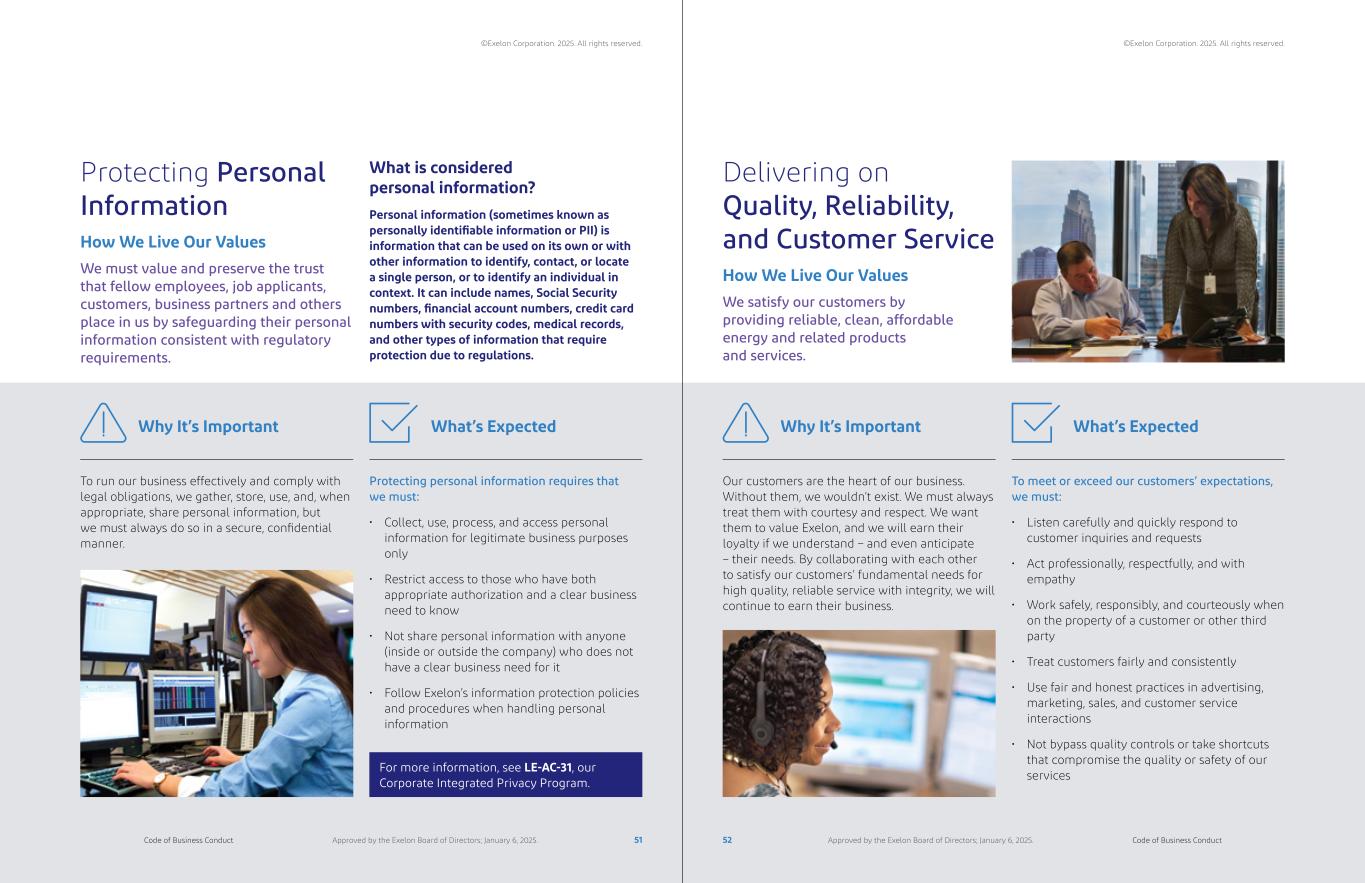 What is considered personal information? Personal information (sometimes known as personally identifiable information or PII) is information that can be used on its own or with other information to identify, contact, or locate a single person, or to identify an individual in context. It can include names, Social Security numbers, financial account numbers, credit card numbers with security codes, medical records, and other types of information that require protection due to regulations. Protecting Personal Information Delivering on Quality, Reliability, and Customer Service We must value and preserve the trust that fellow employees, job applicants, customers, business partners and others place in us by safeguarding their personal information consistent with regulatory requirements. We satisfy our customers by providing reliable, clean, affordable energy and related products and services. How We Live Our Values How We Live Our Values To run our business effectively and comply with legal obligations, we gather, store, use, and, when appropriate, share personal information, but we must always do so in a secure, confidential manner. Why It’s Important Protecting personal information requires that we must: • Collect, use, process, and access personal information for legitimate business purposes only • Restrict access to those who have both appropriate authorization and a clear business need to know • Not share personal information with anyone (inside or outside the company) who does not have a clear business need for it • Follow Exelon’s information protection policies and procedures when handling personal information What’s Expected For more information, see LE-AC-31, our Corporate Integrated Privacy Program. Our customers are the heart of our business. Without them, we wouldn’t exist. We must always treat them with courtesy and respect. We want them to value Exelon, and we will earn their loyalty if we understand – and even anticipate – their needs. By collaborating with each other to satisfy our customers’ fundamental needs for high quality, reliable service with integrity, we will continue to earn their business. Why It’s Important To meet or exceed our customers’ expectations, we must: • Listen carefully and quickly respond to customer inquiries and requests • Act professionally, respectfully, and with empathy • Work safely, responsibly, and courteously when on the property of a customer or other third party • Treat customers fairly and consistently • Use fair and honest practices in advertising, marketing, sales, and customer service interactions • Not bypass quality controls or take shortcuts that compromise the quality or safety of our services What’s Expected 51 52Code of Business Conduct Code of Business ConductApproved by the Exelon Board of Directors; January 6, 2025. Approved by the Exelon Board of Directors; January 6, 2025. ©Exelon Corporation. 2025. All rights reserved. ©Exelon Corporation. 2025. All rights reserved.