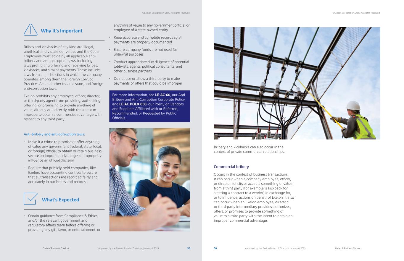 Bribes and kickbacks of any kind are illegal, unethical, and violate our values and the Code. Employees must abide by all applicable anti- bribery and anti-corruption laws, including laws prohibiting offering and receiving bribes, kickbacks, and similar payments. These include laws from all jurisdictions in which the company operates, among them the Foreign Corrupt Practices Act and other federal, state, and foreign anti-corruption laws. Exelon prohibits any employee, officer, director, or third-party agent from providing, authorizing, offering, or promising to provide anything of value, directly or indirectly, with the intent to improperly obtain a commercial advantage with respect to any third party. Anti-bribery and anti-corruption laws: • Make it a crime to promise or offer anything of value any government (federal, state, local, or foreign) official to obtain or retain business, secure an improper advantage, or improperly influence an official decision • Require that publicly held companies, like Exelon, have accounting controls to assure that all transactions are recorded fairly and accurately in our books and records Why It’s Important • Obtain guidance from Compliance & Ethics and/or the relevant government and regulatory affairs team before offering or providing any gift, favor, or entertainment, or What’s Expected For more information, see LE-AC-60, our Anti- Bribery and Anti-Corruption Corporate Policy, and LE-AC-POL8-003, our Policy on Vendors and Suppliers Affiliated with or Referred, Recommended, or Requested by Public Officials. Bribery and kickbacks can also occur in the context of private commercial relationships. Commercial bribery Occurs in the context of business transactions. It can occur when a company employee, officer, or director solicits or accepts something of value from a third party (for example, a kickback for steering a contract to a vendor) in exchange for, or to influence, actions on behalf of Exelon. It also can occur when an Exelon employee, director, or third-party intermediary provides, authorizes, offers, or promises to provide something of value to a third party with the intent to obtain an improper commercial advantage. anything of value to any government official or employee of a state-owned entity • Keep accurate and complete records so all payments are properly documented • Ensure company funds are not used for unlawful purposes • Conduct appropriate due diligence of potential lobbyists, agents, political consultants, and other business partners • Do not use or allow a third party to make payments or offers that could be improper 55 56Code of Business Conduct Code of Business ConductApproved by the Exelon Board of Directors; January 6, 2025. Approved by the Exelon Board of Directors; January 6, 2025. ©Exelon Corporation. 2025. All rights reserved. ©Exelon Corporation. 2025. All rights reserved.