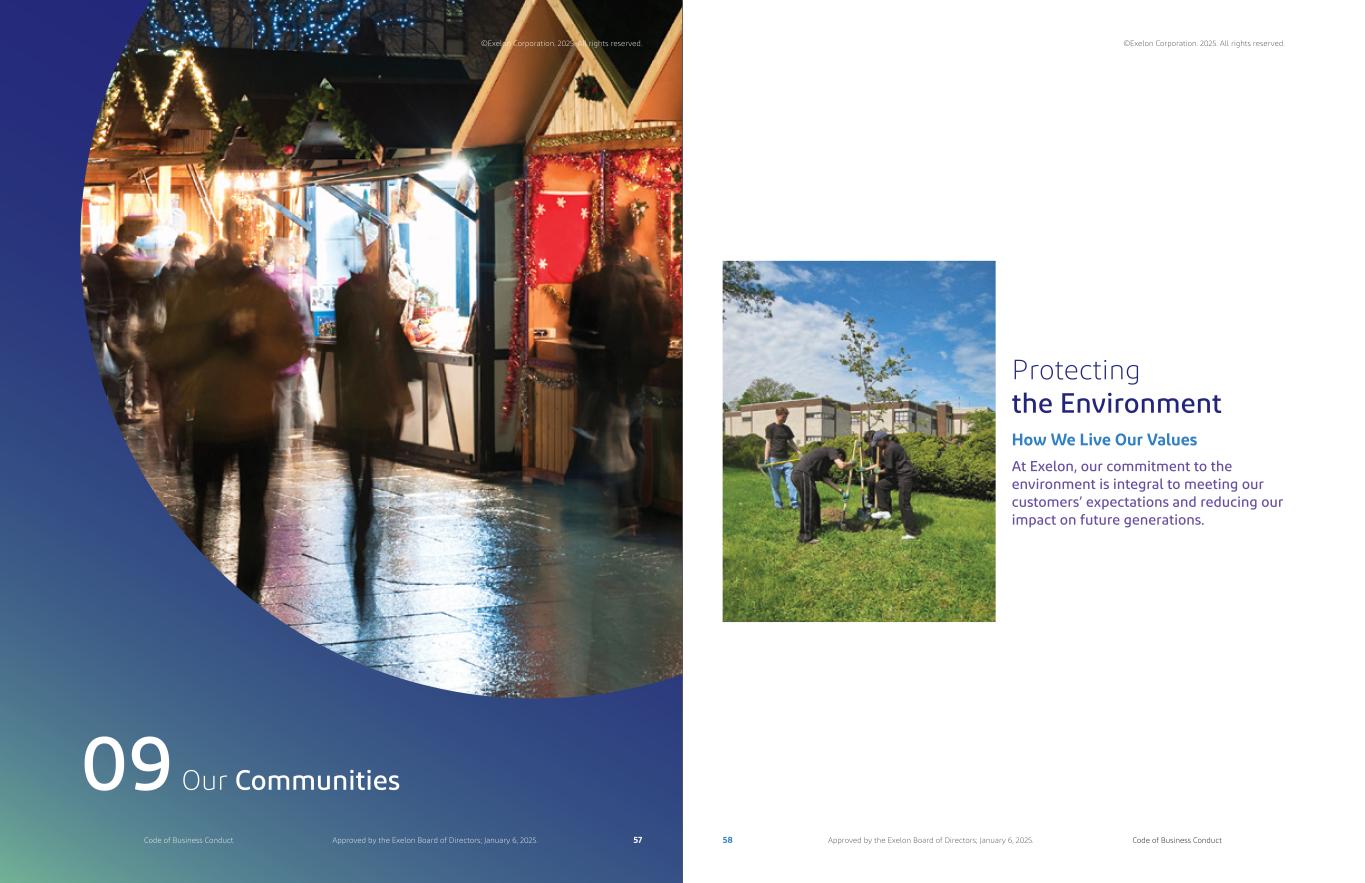 Our Communities09 Protecting the Environment At Exelon, our commitment to the environment is integral to meeting our customers’ expectations and reducing our impact on future generations. How We Live Our Values ©Exelon Corporation. 2025. All rights reserved. 58 Code of Business ConductApproved by the Exelon Board of Directors; January 6, 2025. ©Exelon Corporation. 2025. All rights reserved. 57Code of Business Conduct Approved by the Exelon Board of Directors; January 6, 2025.