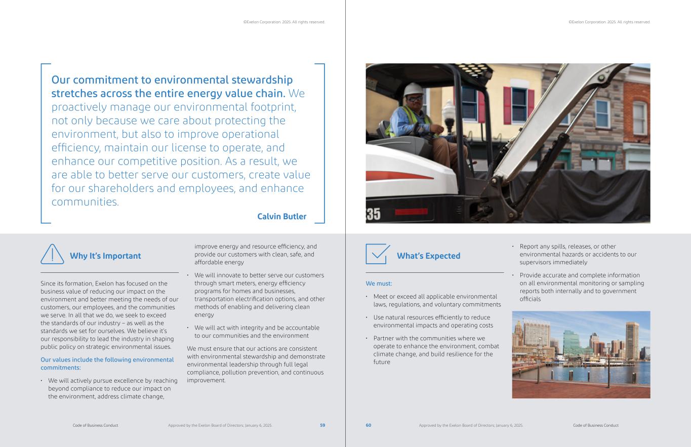 Since its formation, Exelon has focused on the business value of reducing our impact on the environment and better meeting the needs of our customers, our employees, and the communities we serve. In all that we do, we seek to exceed the standards of our industry – as well as the standards we set for ourselves. We believe it’s our responsibility to lead the industry in shaping public policy on strategic environmental issues. Our values include the following environmental commitments: • We will actively pursue excellence by reaching beyond compliance to reduce our impact on the environment, address climate change, Why It’s Important We must: • Meet or exceed all applicable environmental laws, regulations, and voluntary commitments • Use natural resources efficiently to reduce environmental impacts and operating costs • Partner with the communities where we operate to enhance the environment, combat climate change, and build resilience for the future What’s Expected improve energy and resource efficiency, and provide our customers with clean, safe, and affordable energy • We will innovate to better serve our customers through smart meters, energy efficiency programs for homes and businesses, transportation electrification options, and other methods of enabling and delivering clean energy • We will act with integrity and be accountable to our communities and the environment We must ensure that our actions are consistent with environmental stewardship and demonstrate environmental leadership through full legal compliance, pollution prevention, and continuous improvement. Our commitment to environmental stewardship stretches across the entire energy value chain. We proactively manage our environmental footprint, not only because we care about protecting the environment, but also to improve operational efficiency, maintain our license to operate, and enhance our competitive position. As a result, we are able to better serve our customers, create value for our shareholders and employees, and enhance communities. Calvin Butler • Report any spills, releases, or other environmental hazards or accidents to our supervisors immediately • Provide accurate and complete information on all environmental monitoring or sampling reports both internally and to government officials 59 60Code of Business Conduct Code of Business ConductApproved by the Exelon Board of Directors; January 6, 2025. Approved by the Exelon Board of Directors; January 6, 2025. ©Exelon Corporation. 2025. All rights reserved. ©Exelon Corporation. 2025. All rights reserved.