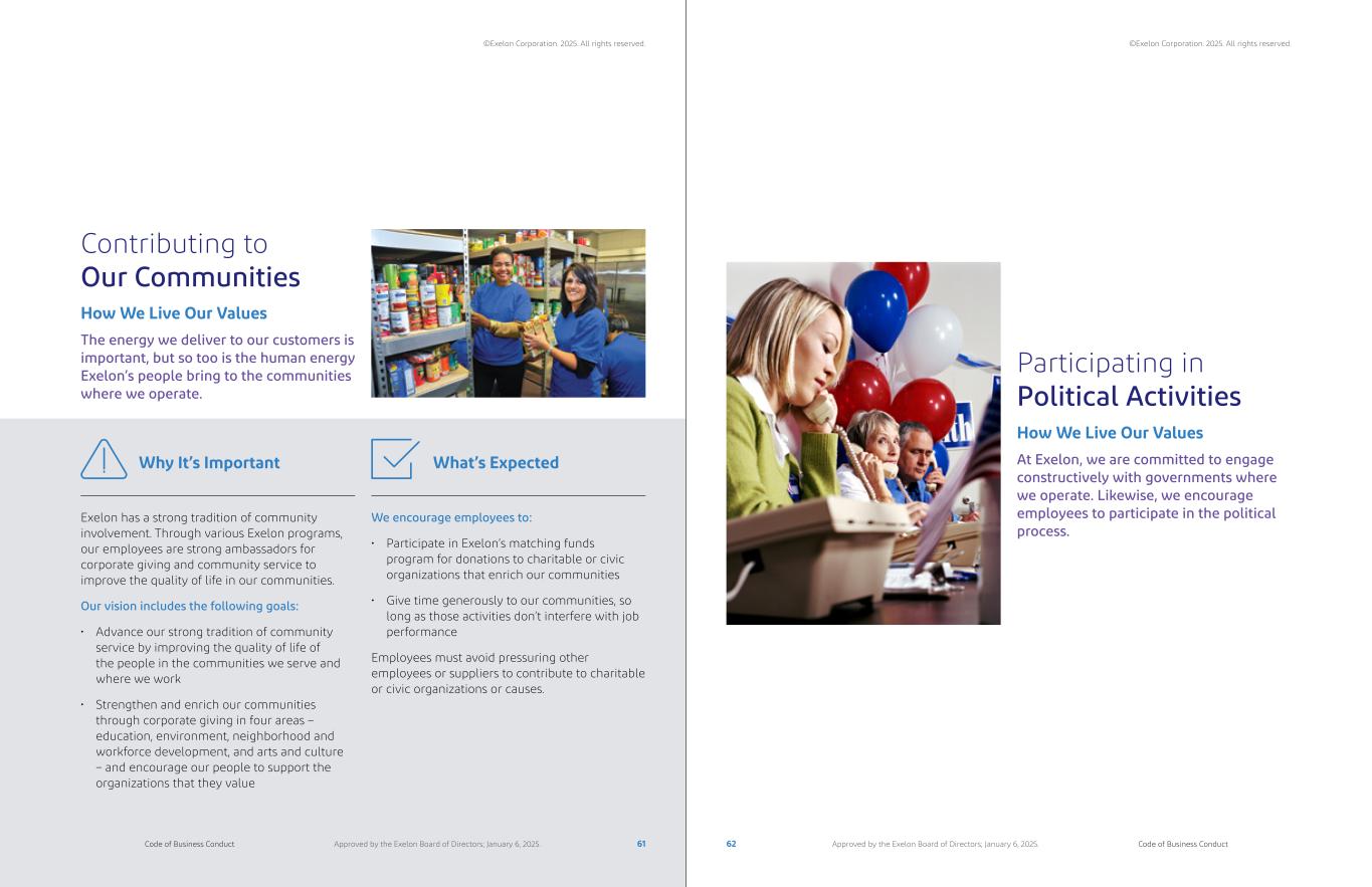 Contributing to Our Communities The energy we deliver to our customers is important, but so too is the human energy Exelon’s people bring to the communities where we operate. How We Live Our Values Exelon has a strong tradition of community involvement. Through various Exelon programs, our employees are strong ambassadors for corporate giving and community service to improve the quality of life in our communities. Our vision includes the following goals: • Advance our strong tradition of community service by improving the quality of life of the people in the communities we serve and where we work • Strengthen and enrich our communities through corporate giving in four areas – education, environment, neighborhood and workforce development, and arts and culture – and encourage our people to support the organizations that they value Why It’s Important We encourage employees to: • Participate in Exelon’s matching funds program for donations to charitable or civic organizations that enrich our communities • Give time generously to our communities, so long as those activities don’t interfere with job performance Employees must avoid pressuring other employees or suppliers to contribute to charitable or civic organizations or causes. What’s Expected Participating in Political Activities At Exelon, we are committed to engage constructively with governments where we operate. Likewise, we encourage employees to participate in the political process. How We Live Our Values 61 62Code of Business Conduct Code of Business ConductApproved by the Exelon Board of Directors; January 6, 2025. Approved by the Exelon Board of Directors; January 6, 2025. ©Exelon Corporation. 2025. All rights reserved. ©Exelon Corporation. 2025. All rights reserved.