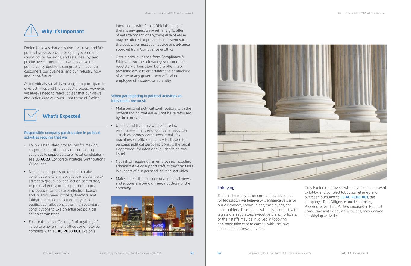 Lobbying Exelon, like many other companies, advocates for legislation we believe will enhance value for our customers, communities, employees, and shareholders. Those of us who have contact with legislators, regulators, executive branch officials, or their staffs may be involved in lobbying and must take care to comply with the laws applicable to these activities. Exelon believes that an active, inclusive, and fair political process promotes open government, sound policy decisions, and safe, healthy, and productive communities. We recognize that public policy decisions can greatly impact our customers, our business, and our industry, now and in the future. As individuals, we all have a right to participate in civic activities and the political process. However, we always need to make it clear that our views and actions are our own – not those of Exelon. Why It’s Important Responsible company participation in political activities requires that we: • Follow established procedures for making corporate contributions and conducting activities to support state or local candidates – see LE-AC-23, Corporate Political Contributions Guidelines • Not coerce or pressure others to make contributions to any political candidate, party, advocacy group, political action committee, or political entity, or to support or oppose any political candidate or election. Exelon and its employees, officers, directors, and lobbyists may not solicit employees for political contributions other than voluntary contributions to Exelon-affiliated political action committees • Ensure that any offer or gift of anything of value to a government official or employee complies with LE-AC-POL8-001, Exelon’s What’s Expected Interactions with Public Officials policy. If there is any question whether a gift, offer of entertainment, or anything else of value may be offered or provided consistent with this policy, we must seek advice and advance approval from Compliance & Ethics • Obtain prior guidance from Compliance & Ethics and/or the relevant government and regulatory affairs team before offering or providing any gift, entertainment, or anything of value to any government official or employee of a state-owned entity. When participating in political activities as individuals, we must: • Make personal political contributions with the understanding that we will not be reimbursed by the company • Understand that only where state law permits, minimal use of company resources – such as phones, computers, email, fax machines, or office supplies – is allowed for personal political purposes (consult the Legal Department for additional guidance on this issue) • Not ask or require other employees, including administrative or support staff, to perform tasks in support of our personal political activities • Make it clear that our personal political views and actions are our own, and not those of the company Only Exelon employees who have been approved to lobby, and contract lobbyists retained and overseen pursuant to LE-AC-PCD8-001, the company’s Due Diligence and Monitoring Procedure for Third Parties Engaged in Political Consulting and Lobbying Activities, may engage in lobbying activities. 63 64Code of Business Conduct Code of Business ConductApproved by the Exelon Board of Directors; January 6, 2025. Approved by the Exelon Board of Directors; January 6, 2025. ©Exelon Corporation. 2025. All rights reserved. ©Exelon Corporation. 2025. All rights reserved.