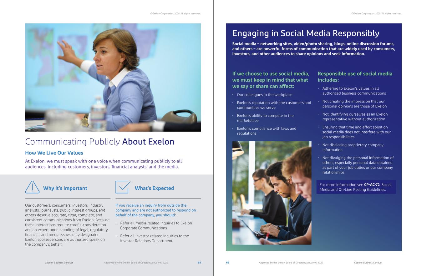 Communicating Publicly About Exelon At Exelon, we must speak with one voice when communicating publicly to all audiences, including customers, investors, financial analysts, and the media. How We Live Our Values Our customers, consumers, investors, industry analysts, journalists, public interest groups, and others deserve accurate, clear, complete, and consistent communications from Exelon. Because these interactions require careful consideration and an expert understanding of legal, regulatory, financial, and media issues, only designated Exelon spokespersons are authorized speak on the company’s behalf. Why It’s Important If you receive an inquiry from outside the company and are not authorized to respond on behalf of the company, you should: • Refer all media-related inquiries to Exelon Corporate Communications • Refer all investor-related inquiries to the Investor Relations Department What’s Expected Engaging in Social Media Responsibly Social media – networking sites, video/photo sharing, blogs, online discussion forums, and others – are powerful forms of communication that are widely used by consumers, investors, and other audiences to share opinions and seek information. If we choose to use social media, we must keep in mind that what we say or share can affect: • Our colleagues in the workplace • Exelon’s reputation with the customers and communities we serve • Exelon’s ability to compete in the marketplace • Exelon’s compliance with laws and regulations Responsible use of social media includes: • Adhering to Exelon’s values in all authorized business communications • Not creating the impression that our personal opinions are those of Exelon • Not identifying ourselves as an Exelon representative without authorization • Ensuring that time and effort spent on social media does not interfere with our job responsibilities • Not disclosing proprietary company information • Not divulging the personal information of others, especially personal data obtained as part of your job duties or our company relationships For more information see CP-AC-72, Social Media and On-Line Posting Guidelines. 65 66Code of Business Conduct Code of Business ConductApproved by the Exelon Board of Directors; January 6, 2025. Approved by the Exelon Board of Directors; January 6, 2025. ©Exelon Corporation. 2025. All rights reserved. ©Exelon Corporation. 2025. All rights reserved.