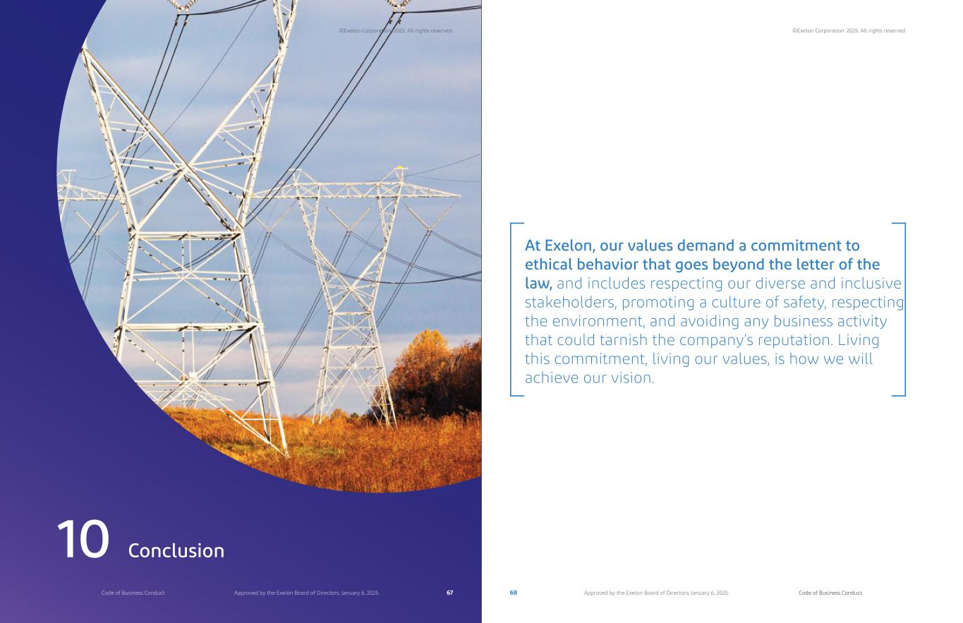 Conclusion10 At Exelon, our values demand a commitment to ethical behavior that goes beyond the letter of the law, and includes respecting our diverse and inclusive stakeholders, promoting a culture of safety, respecting the environment, and avoiding any business activity that could tarnish the company’s reputation. Living this commitment, living our values, is how we will achieve our vision. ©Exelon Corporation. 2025. All rights reserved. ©Exelon Corporation. 2025. All rights reserved. 67 68Code of Business Conduct Code of Business ConductApproved by the Exelon Board of Directors; January 6, 2025. Approved by the Exelon Board of Directors; January 6, 2025.