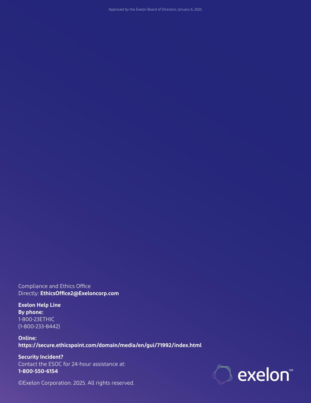 Compliance and Ethics Office Directly: EthicsOffice2@Exeloncorp.com Exelon Help Line By phone: 1-800-23ETHIC (1-800-233-8442) Online: https://secure.ethicspoint.com/domain/media/en/gui/71992/index.html Security Incident? Contact the ESOC for 24-hour assistance at: 1-800-550-6154 ©Exelon Corporation. 2025. All rights reserved. Approved by the Exelon Board of Directors; January 6, 2025.