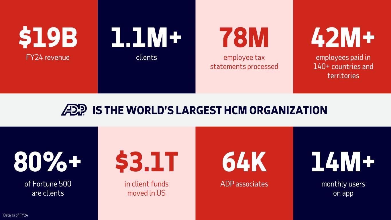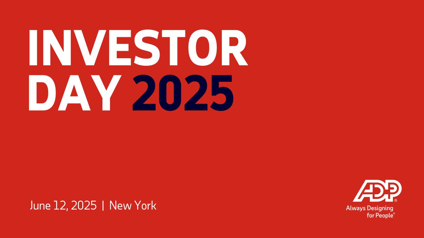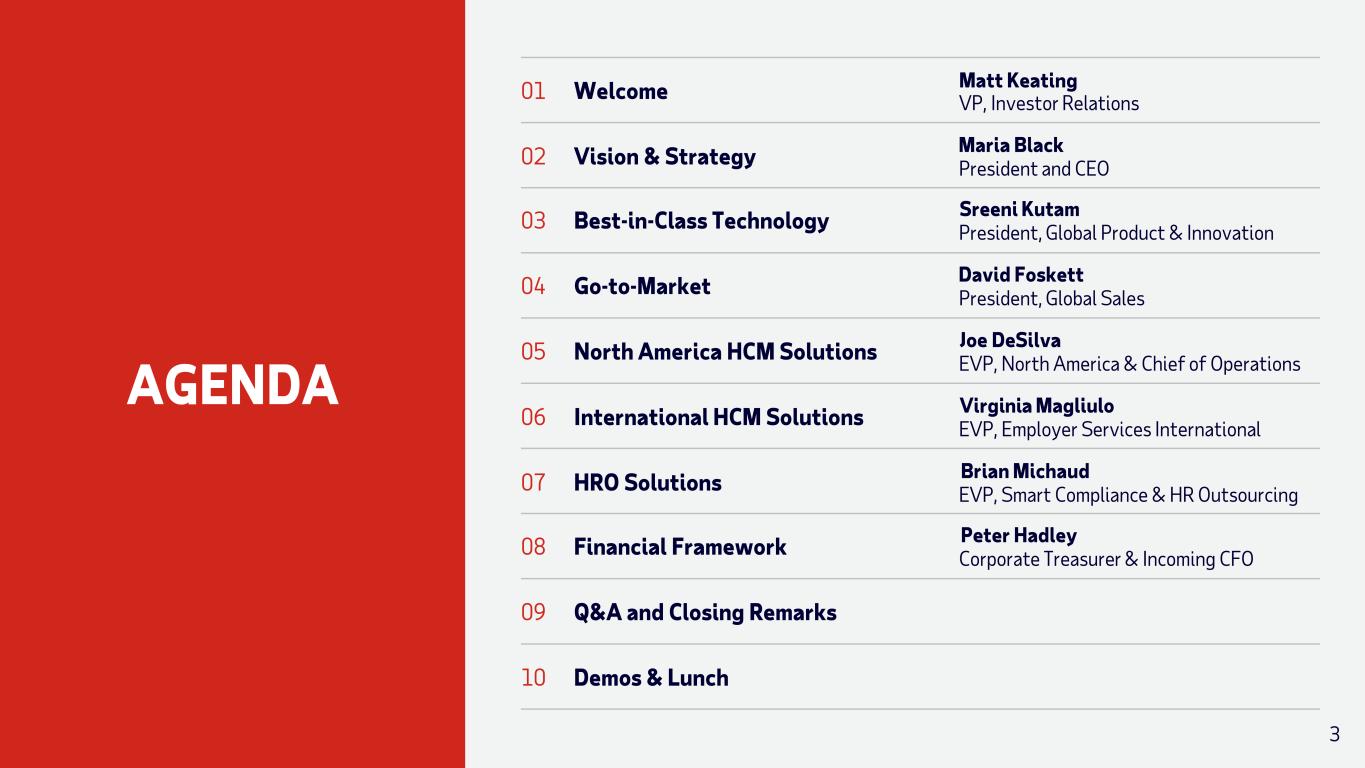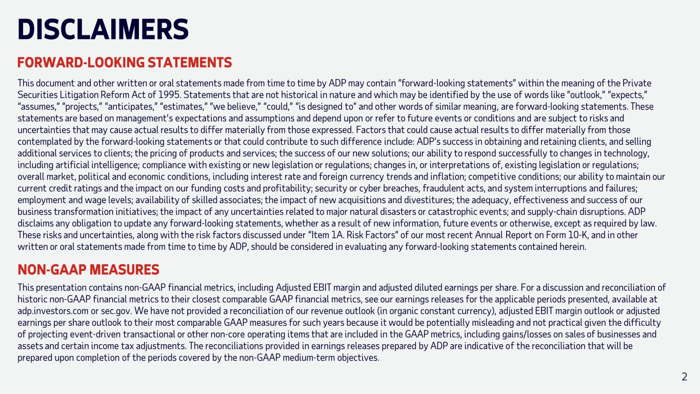 DISCLAIMERS FORWARD-LOOKING STATEMENTS This document and other written or oral statements made from time to time by ADP may contain “forward-looking statements” within the meaning of the Private Securities Litigation Reform Act of 1995. Statements that are not historical in nature and which may be identified by the use of words like “outlook,” “expects,” “assumes,” “projects,” “anticipates,” “estimates,” “we believe,” “could,” “is designed to” and other words of similar meaning, are forward-looking statements. These statements are based on management’s expectations and assumptions and depend upon or refer to future events or conditions and are subject to risks and uncertainties that may cause actual results to differ materially from those expressed. Factors that could cause actual results to differ materially from those contemplated by the forward-looking statements or that could contribute to such difference include: ADP's success in obtaining and retaining clients, and selling additional services to clients; the pricing of products and services; the success of our new solutions; our ability to respond successfully to changes in technology, including artificial intelligence; compliance with existing or new legislation or regulations; changes in, or interpretations of, existing legislation or regulations; overall market, political and economic conditions, including interest rate and foreign currency trends and inflation; competitive conditions; our ability to maintain our current credit ratings and the impact on our funding costs and profitability; security or cyber breaches, fraudulent acts, and system interruptions and failures; employment and wage levels; availability of skilled associates; the impact of new acquisitions and divestitures; the adequacy, effectiveness and success of our business transformation initiatives; the impact of any uncertainties related to major natural disasters or catastrophic events; and supply-chain disruptions. ADP disclaims any obligation to update any forward-looking statements, whether as a result of new information, future events or otherwise, except as required by law. These risks and uncertainties, along with the risk factors discussed under “Item 1A. Risk Factors” of our most recent Annual Report on Form 10-K, and in other written or oral statements made from time to time by ADP, should be considered in evaluating any forward-looking statements contained herein. This presentation contains non-GAAP financial metrics, including Adjusted EBIT margin and adjusted diluted earnings per share. For a discussion and reconciliation of historic non-GAAP financial metrics to their closest comparable GAAP financial metrics, see our earnings releases for the applicable periods presented, available at adp.investors.com or sec.gov. We have not provided a reconciliation of our revenue outlook (in organic constant currency), adjusted EBIT margin outlook or adjusted earnings per share outlook to their most comparable GAAP measures for such years because it would be potentially misleading and not practical given the difficulty of projecting event-driven transactional or other non-core operating items that are included in the GAAP metrics, including gains/losses on sales of businesses and assets and certain income tax adjustments. The reconciliations provided in earnings releases prepared by ADP are indicative of the reconciliation that will be prepared upon completion of the periods covered by the non-GAAP medium-term objectives. NON-GAAP MEASURES 2
