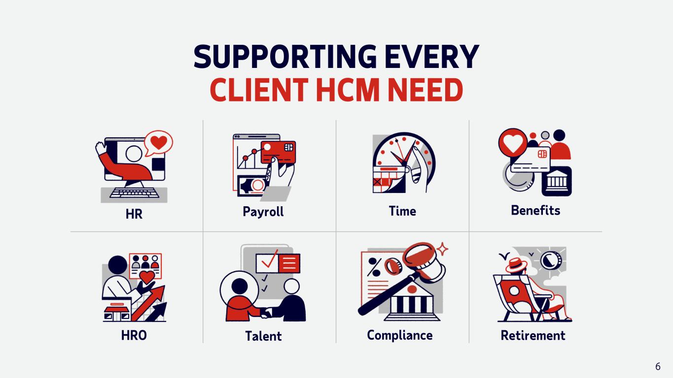 80%+ of Fortune 500 are clients 42M+ employees paid in 140+ countries and territories 1.1M+ clients $19B FY24 revenue $3.1T in client funds moved in US 78M employee tax statements processed 64K ADP associates 14M+ monthly users on app Data as of FY24 5 IS THE WORLD’S LARGEST HCM ORGANIZATION