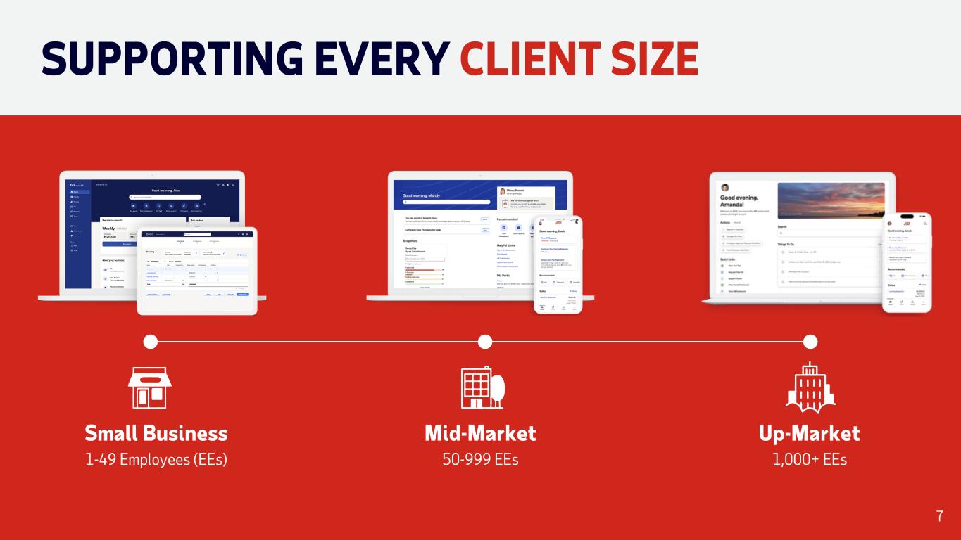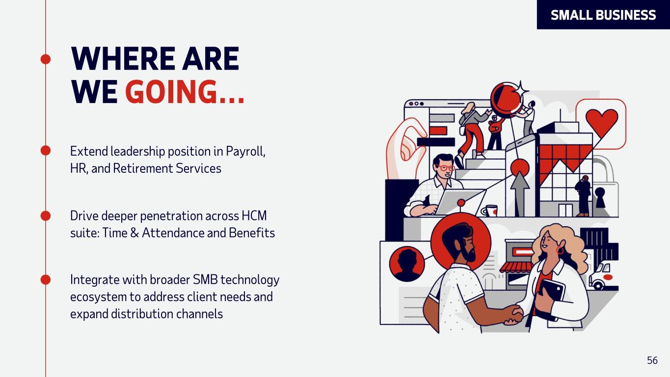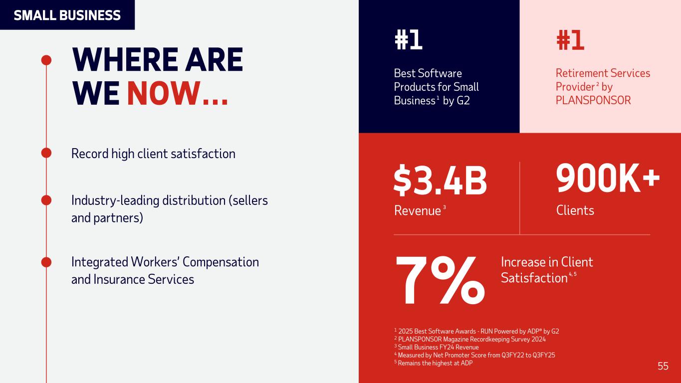 WHERE ARE WE NOW… Record high client satisfaction Industry-leading distribution (sellers and partners) Integrated Workers’ Compensation and Insurance Services Best Software Products for Small Business by G2 #1 1 #1 Retirement Services Provider by PLANSPONSOR 2 Clients 900K+ Revenue $3.4B Increase in Client Satisfaction7% 1 2025 Best Software Awards - RUN Powered by ADP® by G2 2 PLANSPONSOR Magazine Recordkeeping Survey 2024 3 Small Business FY24 Revenue 4 Measured by Net Promoter Score from Q3FY22 to Q3FY25 5 Remains the highest at ADP 3 4, 5 55 SMALL BUSINESS