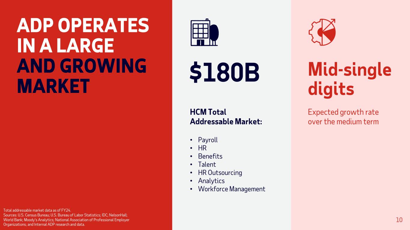 ADP OPERATES IN A LARGE AND GROWING MARKET Mid-single digits Expected growth rate over the medium term $180B HCM Total Addressable Market: • Payroll • HR • Benefits • Talent • HR Outsourcing • Analytics • Workforce Management Total addressable market data as of FY24. Sources: U.S. Census Bureau; U.S. Bureau of Labor Statistics; IDC; NelsonHall; World Bank; Moody’s Analytics; National Association of Professional Employer Organizations; and Internal ADP research and data. 10