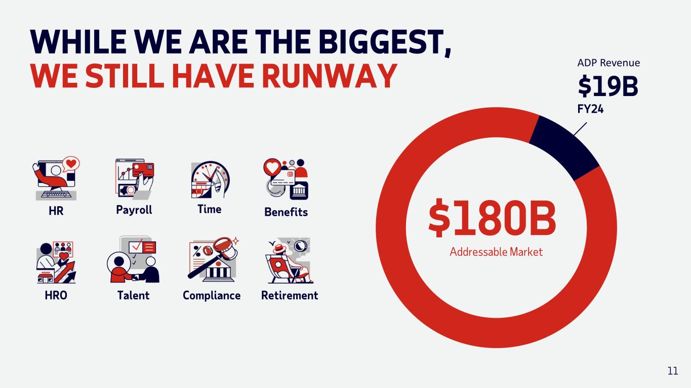 $180B Addressable Market WHILE WE ARE THE BIGGEST, WE STILL HAVE RUNWAY 11 ADP Revenue $19B FY24 PayrollHR Time Benefits HRO Talent RetirementCompliance