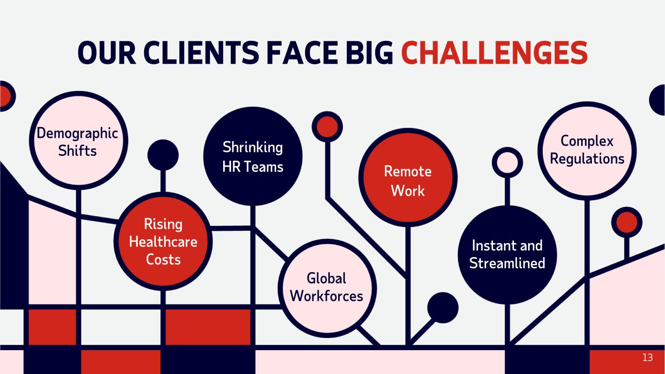 OUR CLIENTS FACE BIG CHALLENGES Demographic Shifts Rising Healthcare Costs Shrinking HR Teams Global Workforces Remote Work Instant and Streamlined Complex Regulations 13