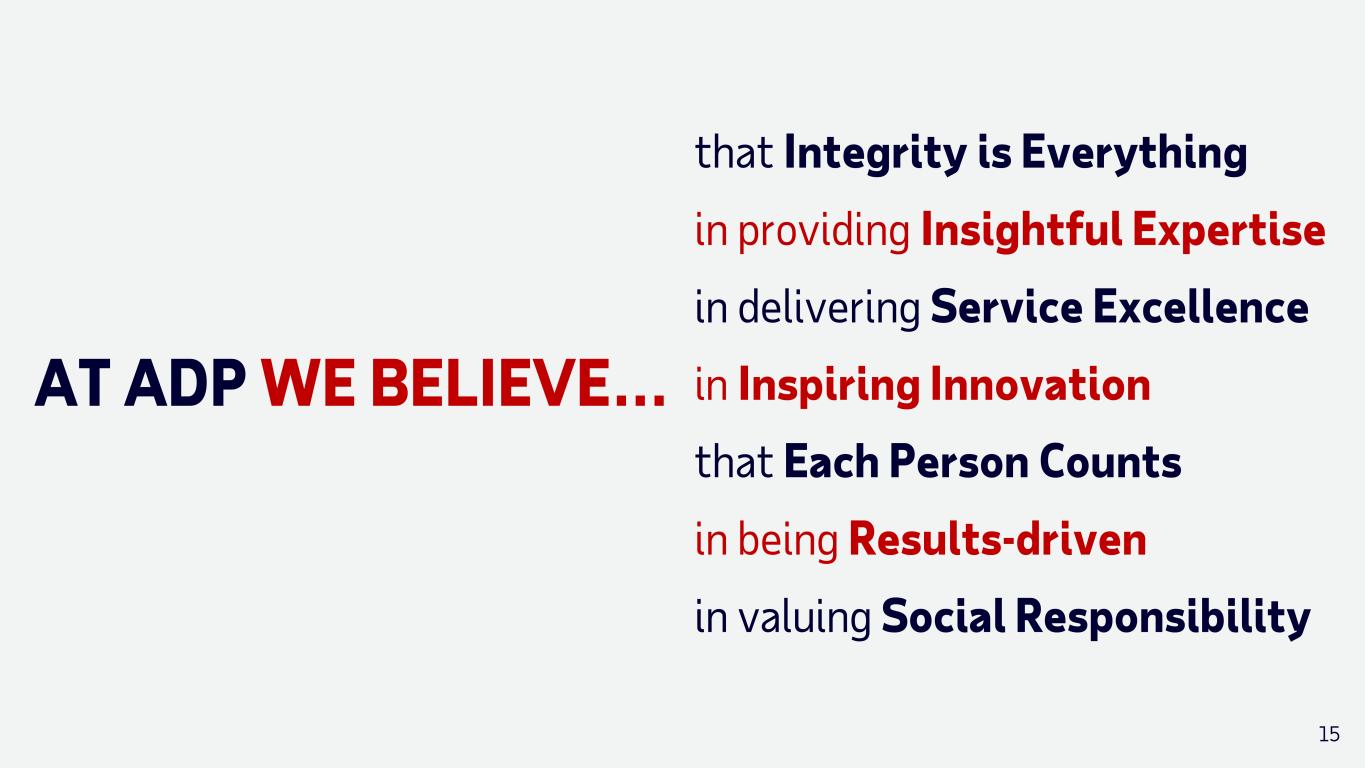 15 AT ADP WE BELIEVE… that Integrity is Everything in providing Insightful Expertise in delivering Service Excellence in Inspiring Innovation that Each Person Counts in being Results-driven in valuing Social Responsibility