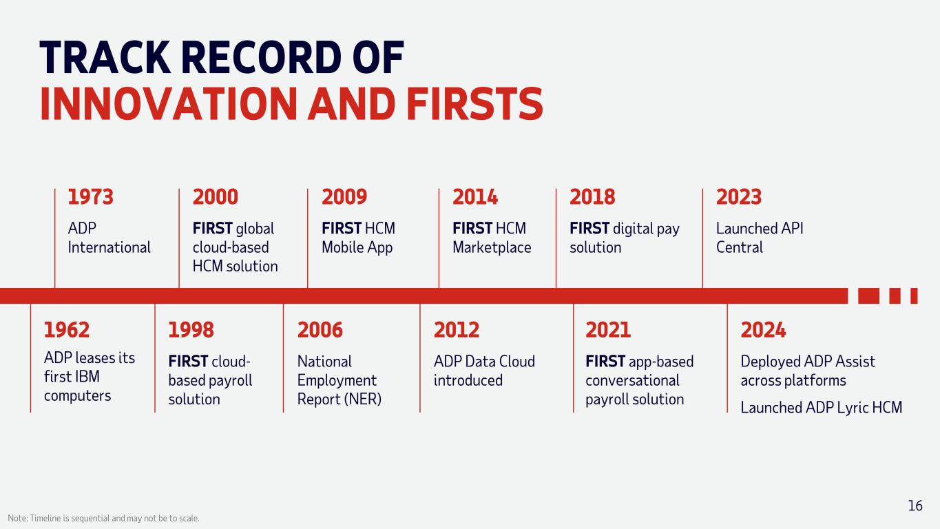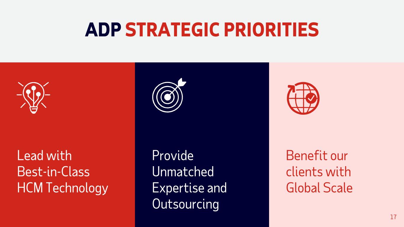 TRACK RECORD OF INNOVATION AND FIRSTS 1973 ADP International 2000 FIRST global cloud-based HCM solution 2009 FIRST HCM Mobile App 2014 FIRST HCM Marketplace 2018 FIRST digital pay solution 2023 Launched API Central 1962 ADP leases its first IBM computers 1998 FIRST cloud- based payroll solution 2006 National Employment Report (NER) 2012 ADP Data Cloud introduced 2021 FIRST app-based conversational payroll solution 2024 Deployed ADP Assist across platforms Launched ADP Lyric HCM Note: Timeline is sequential and may not be to scale. 16