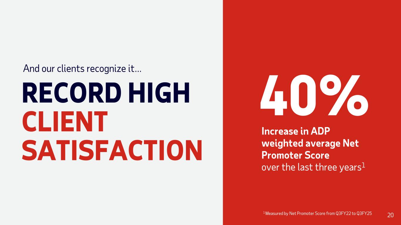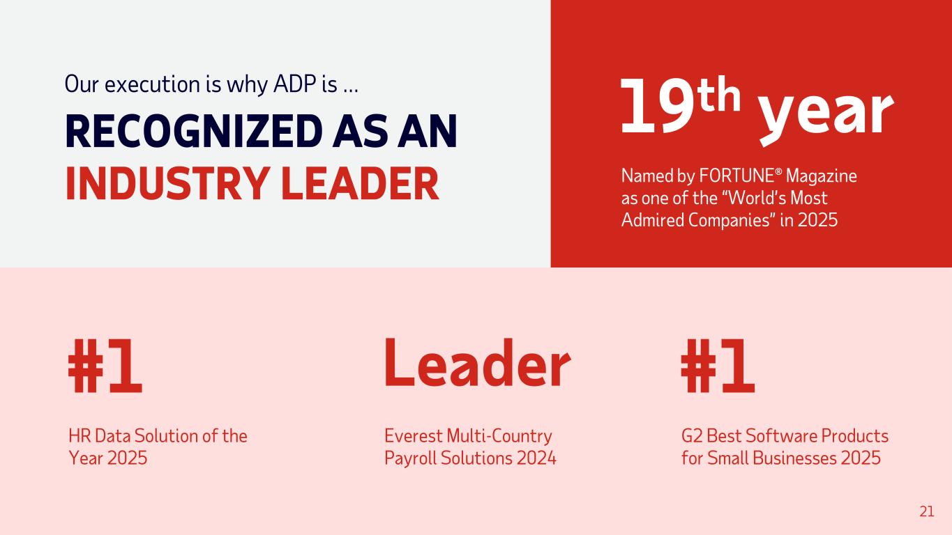 And our clients recognize it… RECORD HIGH CLIENT SATISFACTION Increase in ADP weighted average Net Promoter Score 40% over the last three years1 20 1 Measured by Net Promoter Score from Q3FY22 to Q3FY25