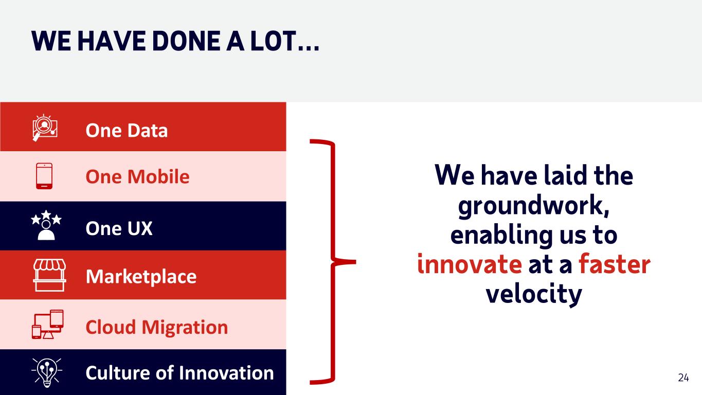 WE HAVE DONE A LOT… One Data One UX One Mobile Culture of Innovation Cloud Migration Marketplace 24 We have laid the groundwork, enabling us to innovate at a faster velocity