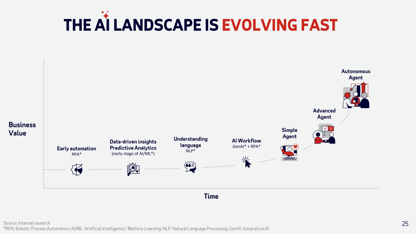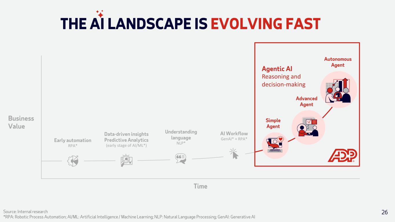 THE AI LANDSCAPE IS EVOLVING FAST Time Business Value Source: Internal research *RPA: Robotic Process Automation; AI/ML: Artificial Intelligence / Machine Learning; NLP: Natural Language Processing; GenAI: Generative AI Early automation RPA* Understanding language NLP* Data-driven insights Predictive Analytics (early stage of AI/ML*) AI Workflow GenAI* + RPA* Autonomous Agent Simple Agent Advanced Agent 25