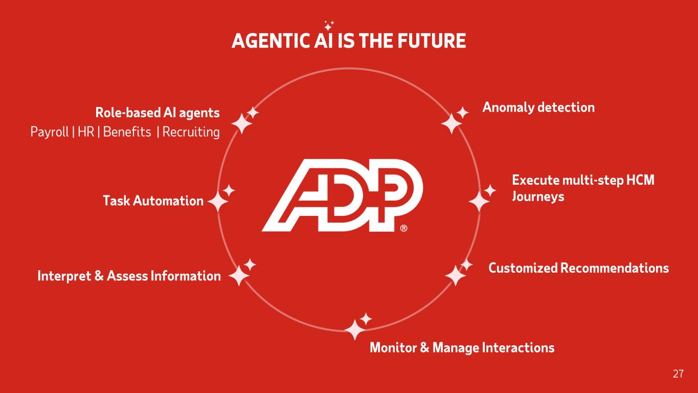 STRATEGICALLY INFUSING AI ACROSS THE BUSINESS Embed role-based AI agents into our products to improve client experience • Proactive Nudges • Recommended best practices • Automated task completion Delivered ADP Assist across several products; driving adoption STRATEGY 29 ~4M Interactions on ADP Assist1 1 FY25 year-to-date PROGRESSPRODUCTS1 2 SERVICE 3 SALES R&D4