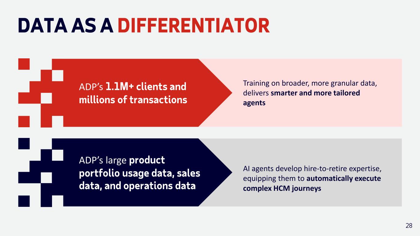 DATA AS A DIFFERENTIATOR ADP’s 1.1M+ clients and millions of transactions Training on broader, more granular data, delivers smarter and more tailored agents AI agents develop hire-to-retire expertise, equipping them to automatically execute complex HCM journeys ADP’s large product portfolio usage data, sales data, and operations data 28