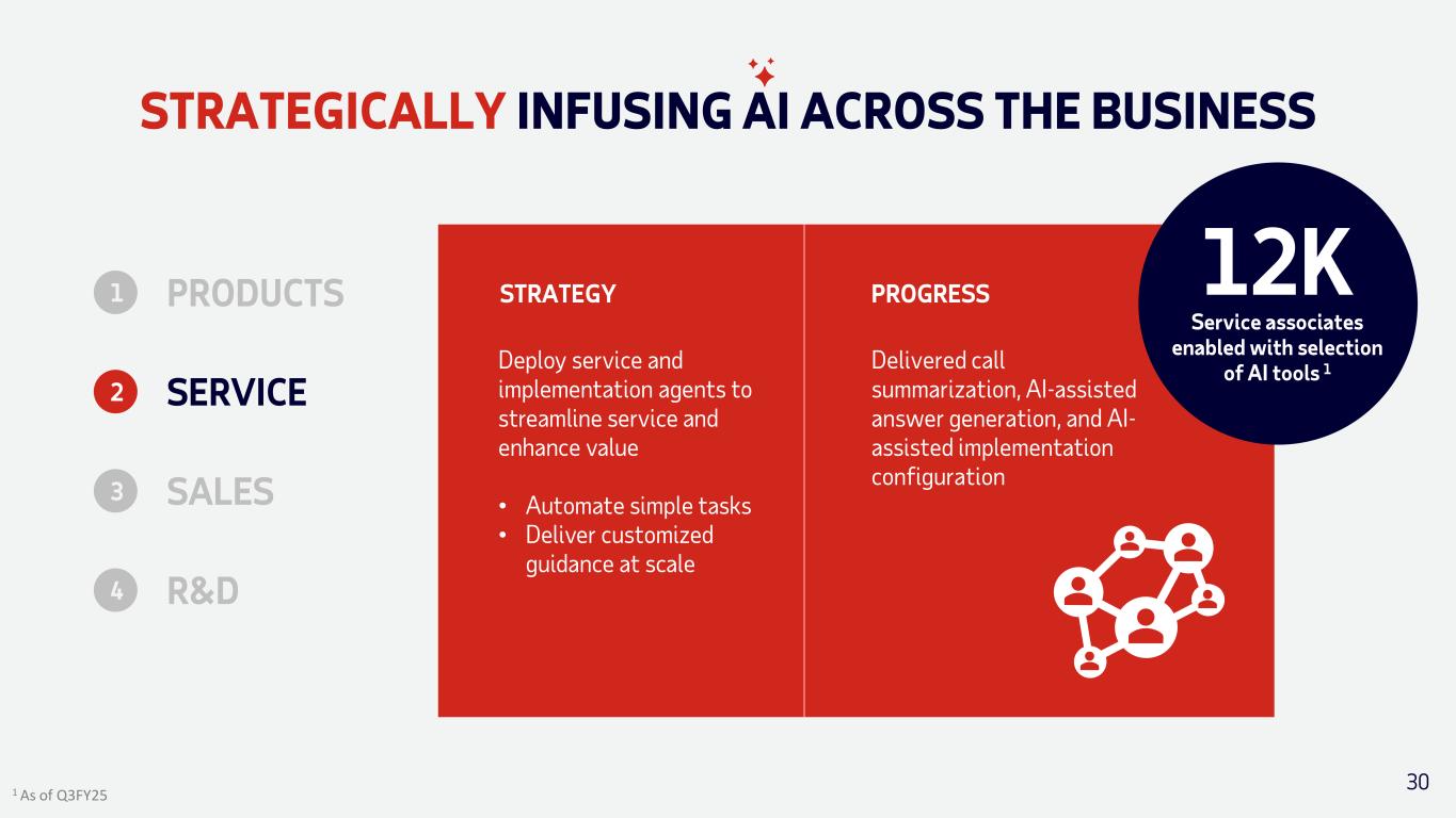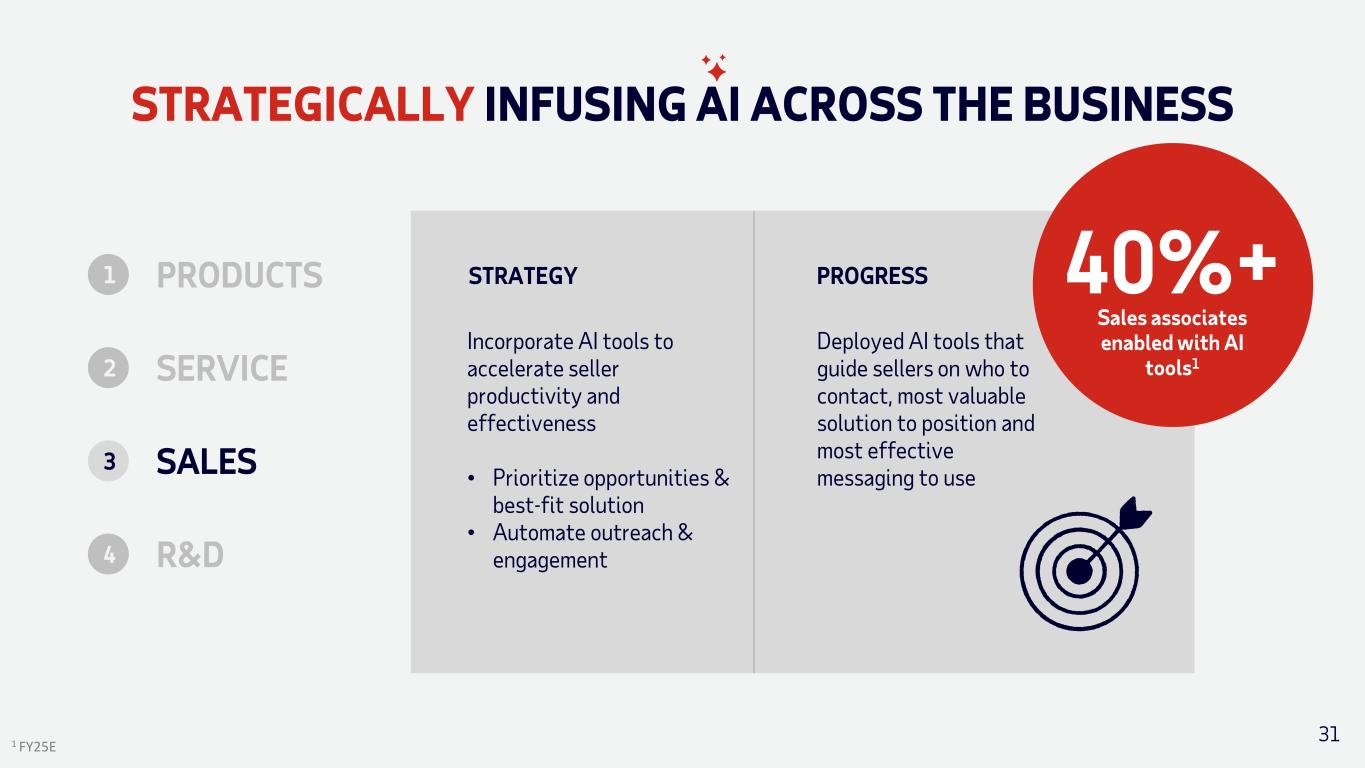 STRATEGICALLY INFUSING AI ACROSS THE BUSINESS 30 1 As of Q3FY25 Deploy service and implementation agents to streamline service and enhance value • Automate simple tasks • Deliver customized guidance at scale Delivered call summarization, AI-assisted answer generation, and AI- assisted implementation configuration STRATEGY 12K Service associates enabled with selection of AI tools 1 PROGRESSPRODUCTS1 2 SERVICE 3 SALES R&D4