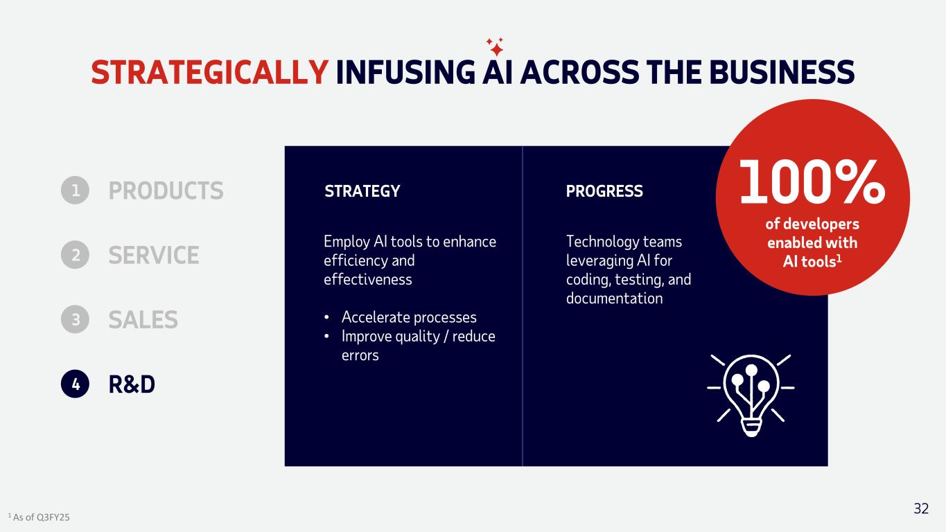 STRATEGICALLY INFUSING AI ACROSS THE BUSINESS 31 Incorporate AI tools to accelerate seller productivity and effectiveness • Prioritize opportunities & best-fit solution • Automate outreach & engagement Deployed AI tools that guide sellers on who to contact, most valuable solution to position and most effective messaging to use STRATEGY 40%+ Sales associates enabled with AI tools1 PROGRESSPRODUCTS1 2 SERVICE 3 SALES R&D4 1 FY25E