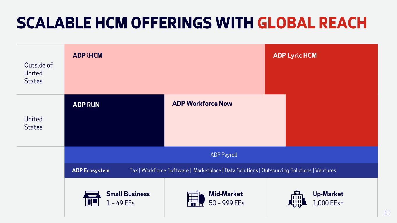 SCALABLE HCM OFFERINGS WITH GLOBAL REACH Outside of United States United States ADP iHCM ADP Lyric HCM ADP RUN ADP Workforce Now ADP Ecosystem Tax | WorkForce Software | Marketplace | Data Solutions | Outsourcing Solutions | Ventures Small Business 1 – 49 EEs Mid-Market 50 – 999 EEs Up-Market 1,000 EEs+ ADP Payroll 33