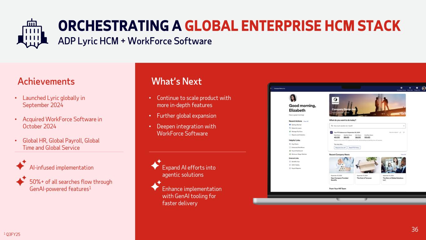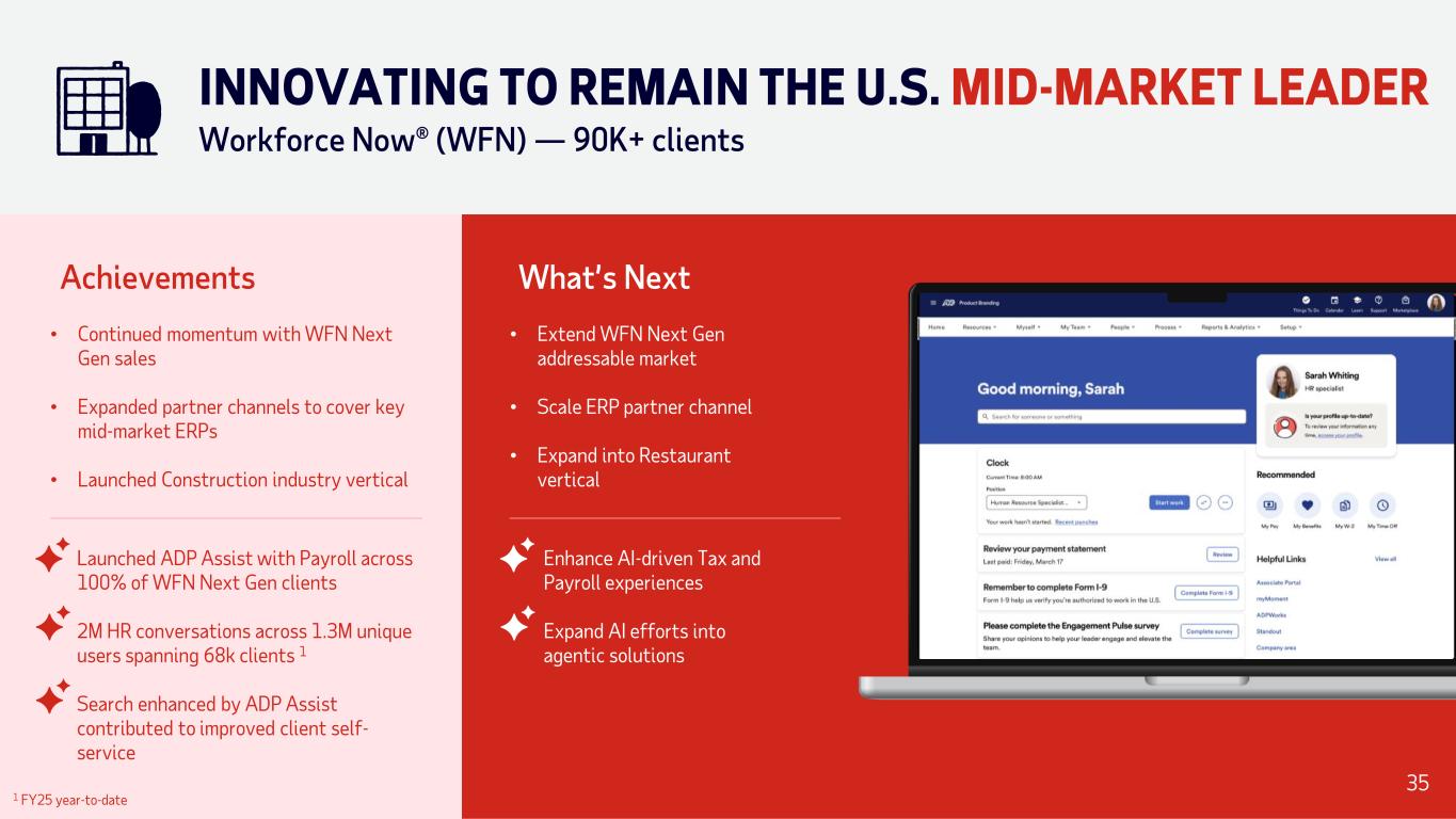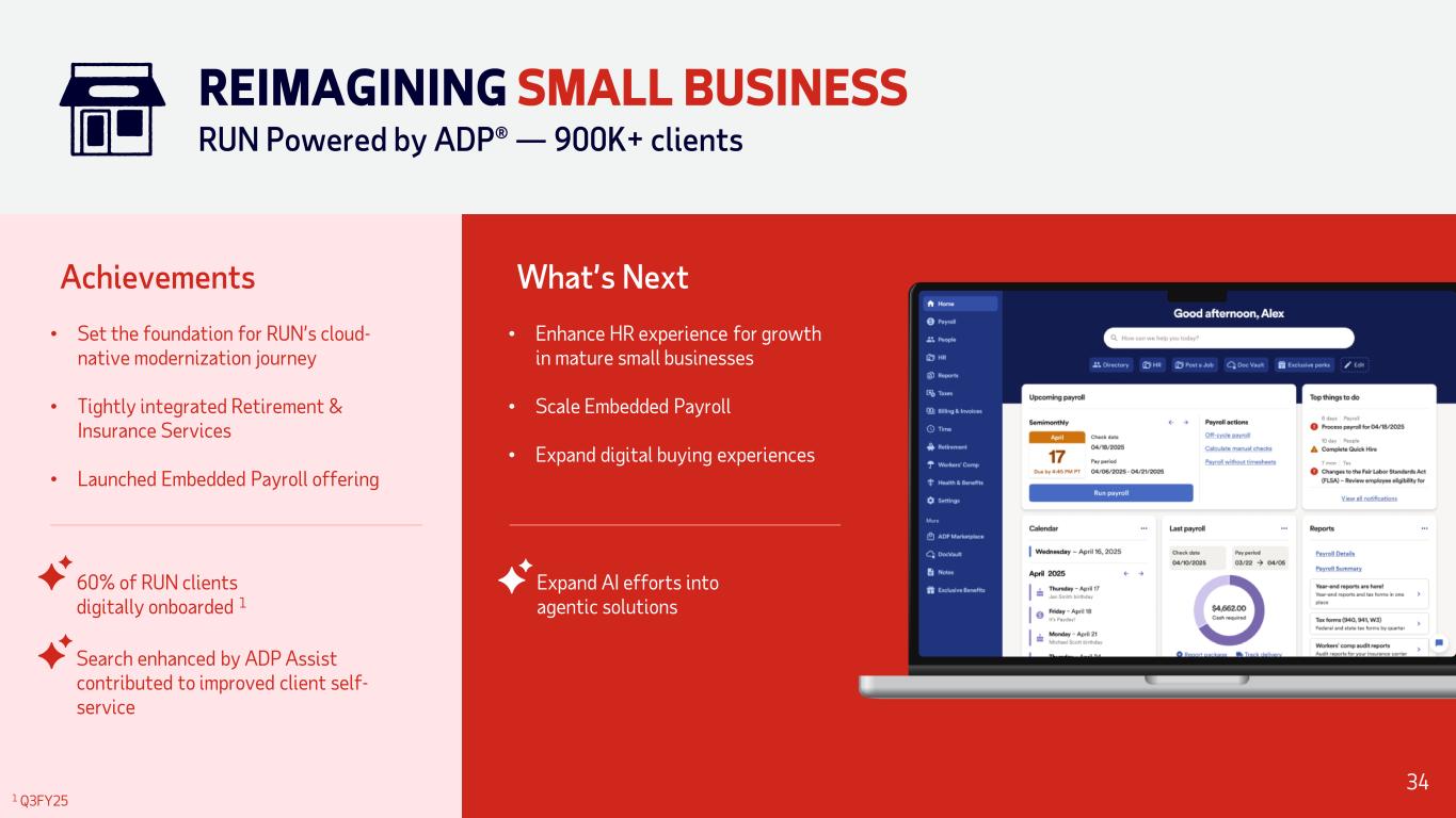 Achievements • Set the foundation for RUN’s cloud- native modernization journey • Tightly integrated Retirement & Insurance Services • Launched Embedded Payroll offering 60% of RUN clients digitally onboarded 1 Search enhanced by ADP Assist contributed to improved client self- service • Enhance HR experience for growth in mature small businesses • Scale Embedded Payroll • Expand digital buying experiences What’s Next Expand AI efforts into agentic solutions 1 Q3FY25 REIMAGINING SMALL BUSINESS RUN Powered by ADP® — 900K+ clients 34