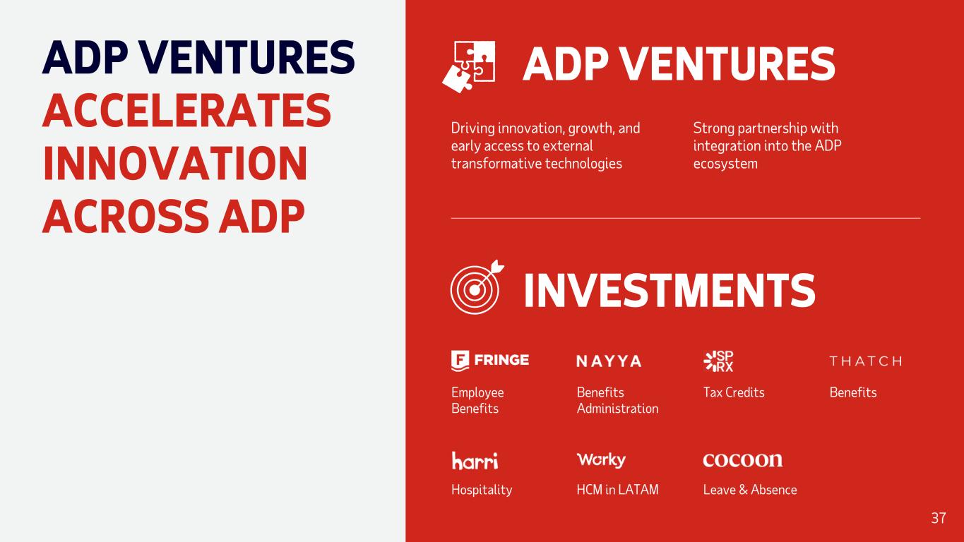 ADP VENTURES ACCELERATES INNOVATION ACROSS ADP Strong partnership with integration into the ADP ecosystem ADP VENTURES INVESTMENTS Employee Benefits Leave & AbsenceHospitality Tax Credits Benefits HCM in LATAM Driving innovation, growth, and early access to external transformative technologies Benefits Administration 37