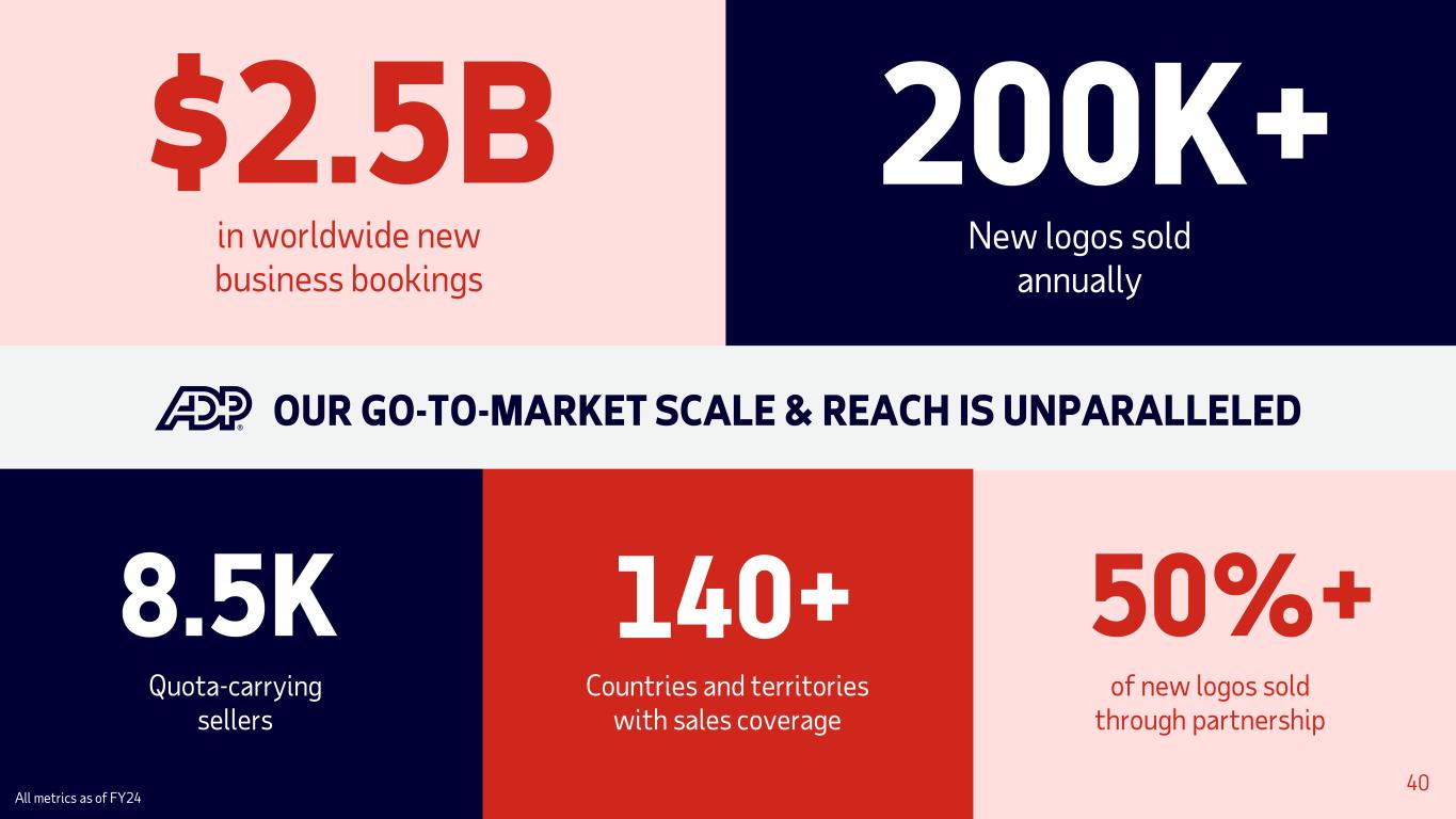 $2.5B in worldwide new business bookings 8.5K Quota-carrying sellers 50%+ of new logos sold through partnership 140+ Countries and territories with sales coverage 200K+ New logos sold annually 40 All metrics as of FY24 OUR GO-TO-MARKET SCALE & REACH IS UNPARALLELED