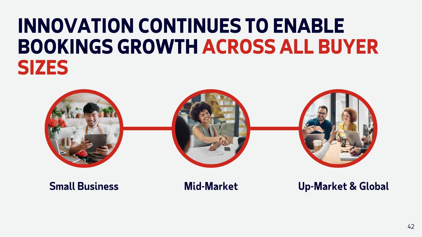 Products Capitalize on new offerings and enhancements Marketing Extend our lead in digital demand generation Channels Drive new logos through our partner ecosystem Headcount Continue to expand our sales force WE DRIVE BOOKINGS GROWTH THROUGH INNOVATION AND SCALE 41 Productivity Enable sellers to sell more