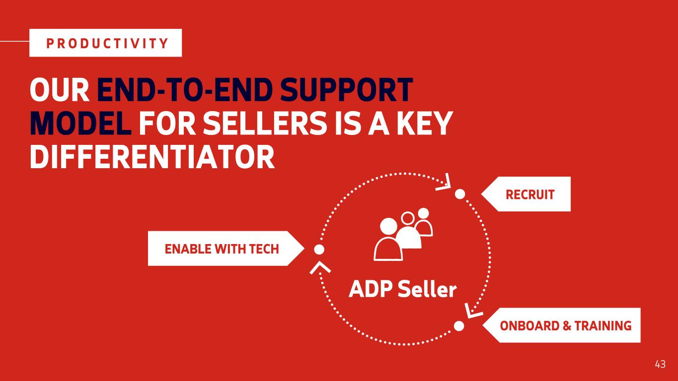 OUR END-TO-END SUPPORT MODEL FOR SELLERS IS A KEY DIFFERENTIATOR P R O D U C T I V I T Y ADP Seller RECRUIT ONBOARD & TRAINING ENABLE WITH TECH 43