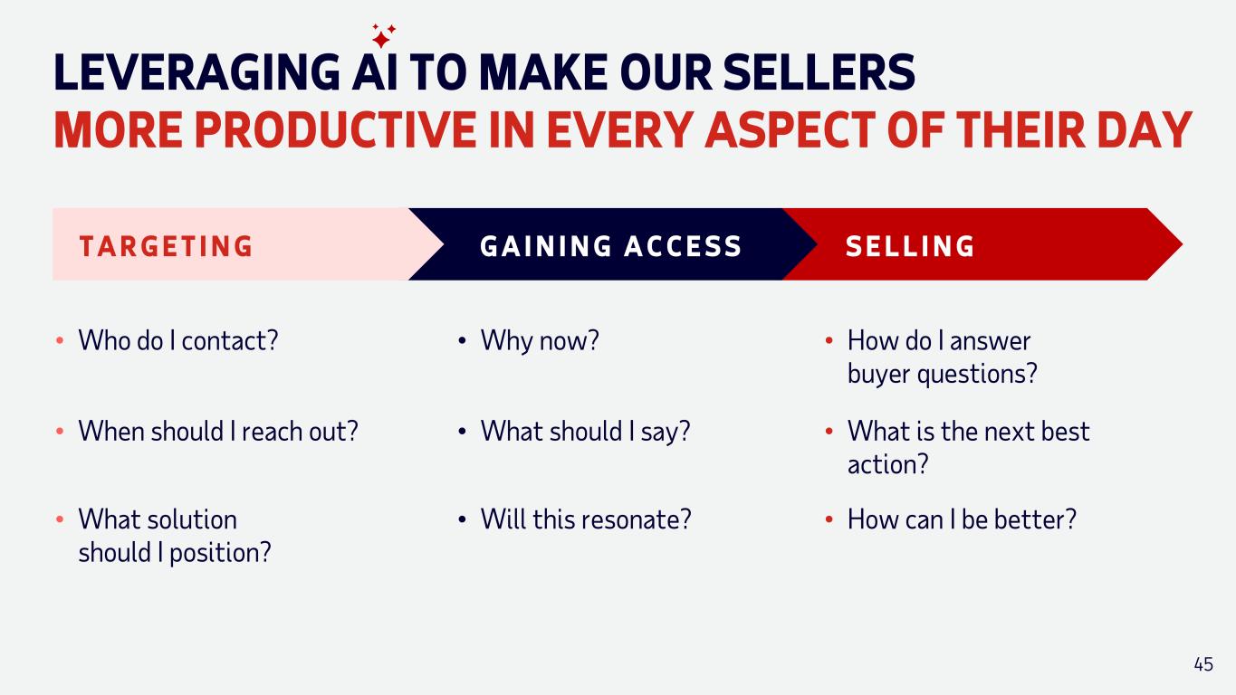 LEVERAGING AI TO MAKE OUR SELLERS MORE PRODUCTIVE IN EVERY ASPECT OF THEIR DAY • Who do I contact? • Why now? • How do I answer buyer questions? • When should I reach out? • What should I say? • What is the next best action? • What solution should I position? • Will this resonate? • How can I be better? S E L L I N GT A R G E T I N G G A I N I N G A C C E S S 45