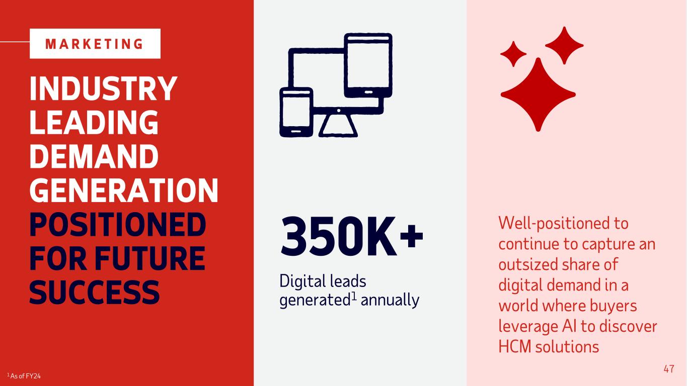 INDUSTRY LEADING DEMAND GENERATION POSITIONED FOR FUTURE SUCCESS Well-positioned to continue to capture an outsized share of digital demand in a world where buyers leverage AI to discover HCM solutions 350K+ Digital leads generated1 annually M A R K E T I N G 47 1 As of FY24