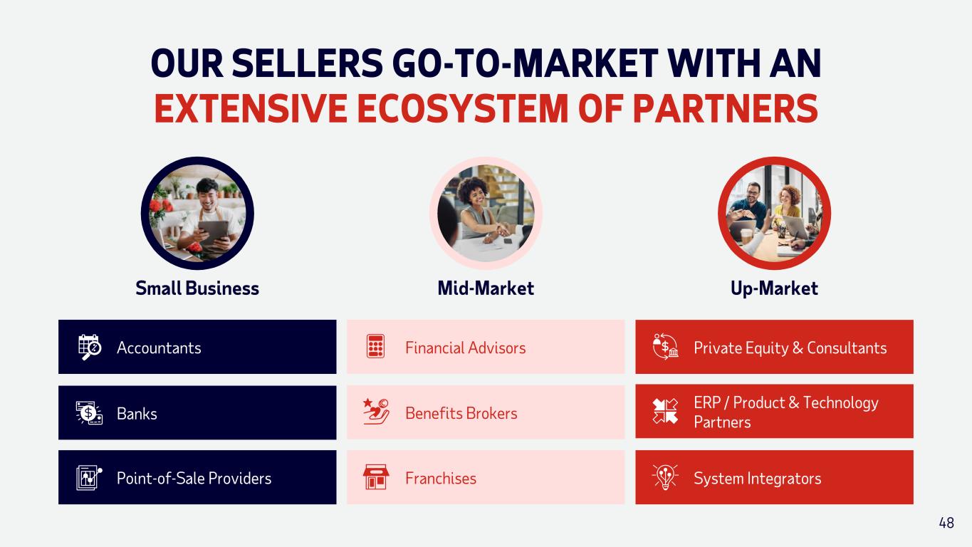 OUR SELLERS GO-TO-MARKET WITH AN EXTENSIVE ECOSYSTEM OF PARTNERS Small Business Accountants Banks Point-of-Sale Providers Mid-Market Financial Advisors Franchises Benefits Brokers Up-Market ERP / Product & Technology Partners Private Equity & Consultants System Integrators 48