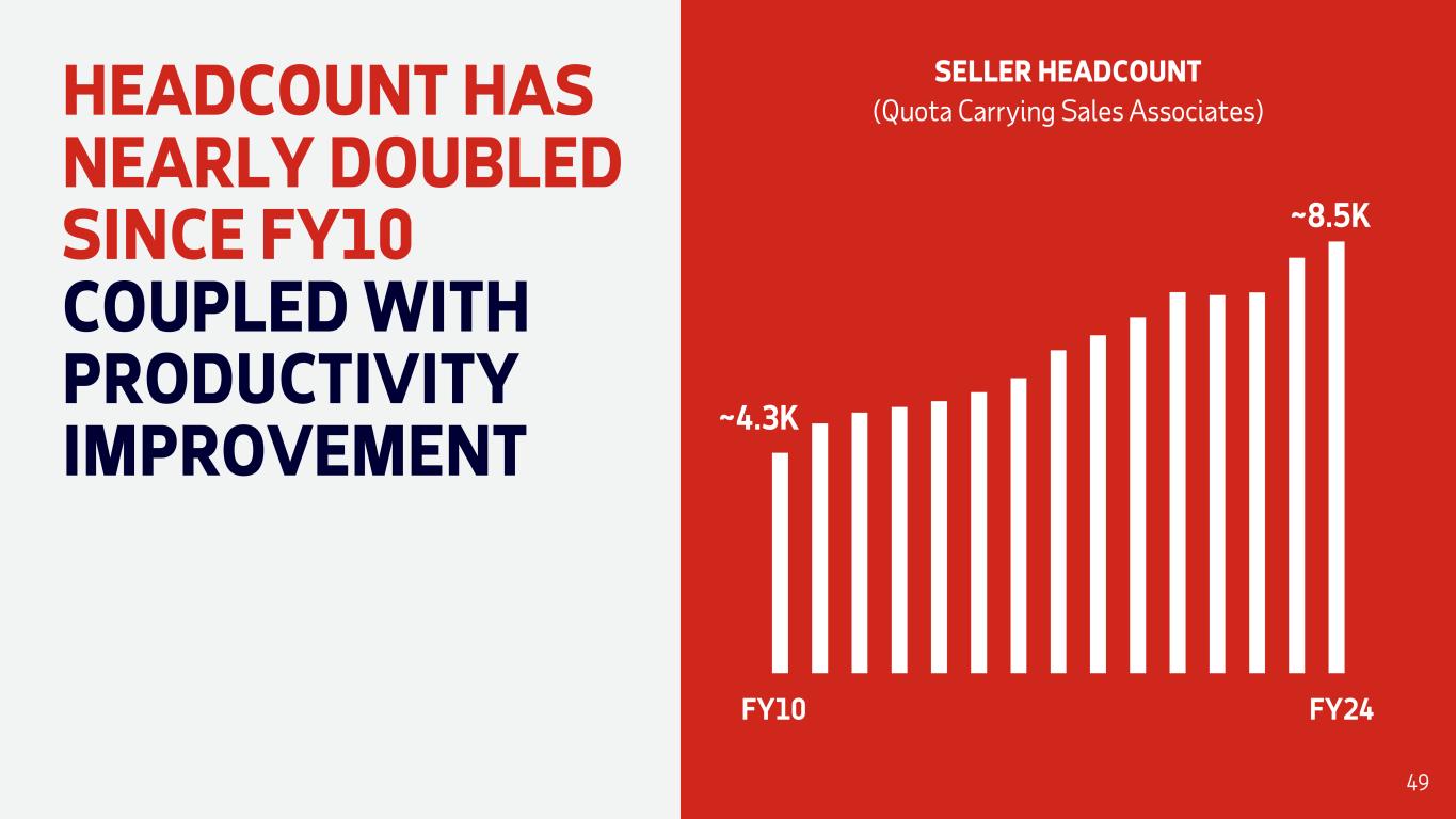 HEADCOUNT HAS NEARLY DOUBLED SINCE FY10 COUPLED WITH PRODUCTIVITY IMPROVEMENT SELLER HEADCOUNT (Quota Carrying Sales Associates) FY10 FY24 ~8.5K ~4.3K 49