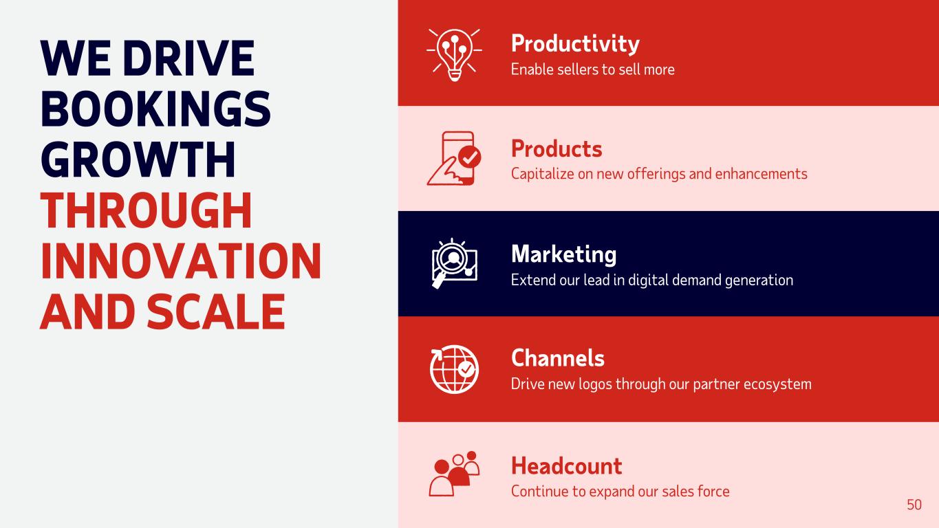 Products Capitalize on new offerings and enhancements Marketing Extend our lead in digital demand generation Channels Drive new logos through our partner ecosystem Headcount Continue to expand our sales force WE DRIVE BOOKINGS GROWTH THROUGH INNOVATION AND SCALE 50 Productivity Enable sellers to sell more