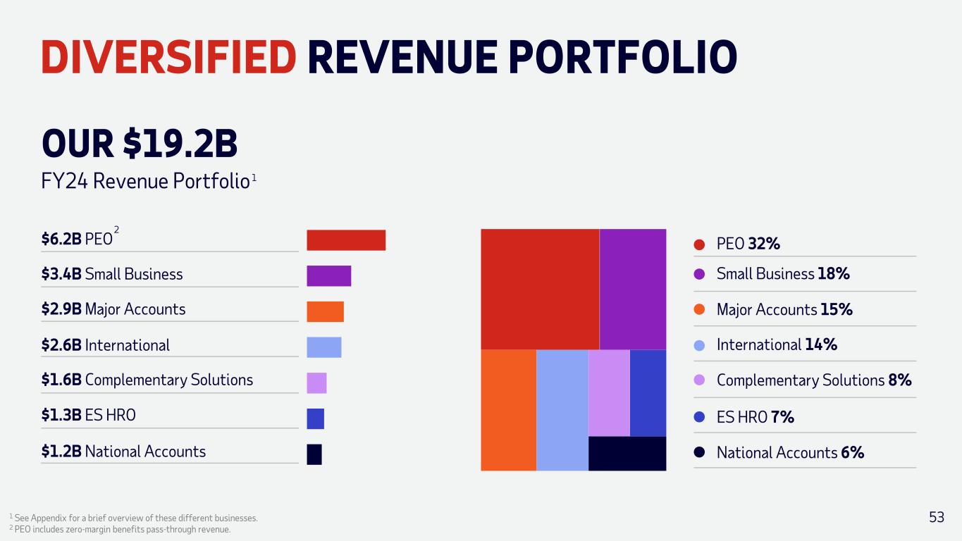 DIVERSIFIED REVENUE PORTFOLIO PEO 32% Small Business 18% Major Accounts 15% National Accounts 6% International 14% ES HRO 7% Complementary Solutions 8% $6.2B PEO $3.4B Small Business $2.9B Major Accounts $2.6B International $1.6B Complementary Solutions $1.2B National Accounts $1.3B ES HRO 1 See Appendix for a brief overview of these different businesses. 2 PEO includes zero-margin benefits pass-through revenue. 53 FY24 Revenue Portfolio OUR $19.2B 1 2