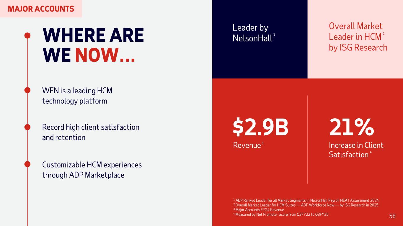 WHERE ARE WE NOW… WFN is a leading HCM technology platform Record high client satisfaction and retention Customizable HCM experiences through ADP Marketplace Leader by NelsonHall 1 Overall Market Leader in HCM by ISG Research 2 Revenue $2.9B Increase in Client Satisfaction 21% 1 ADP Ranked Leader for all Market Segments in NelsonHall Payroll NEAT Assessment 2024 2 Overall Market Leader for HCM Suites — ADP Workforce Now — by ISG Research in 2025 3 Major Accounts FY24 Revenue 4 Measured by Net Promoter Score from Q3FY22 to Q3FY25 3 4 58 MAJOR ACCOUNTS
