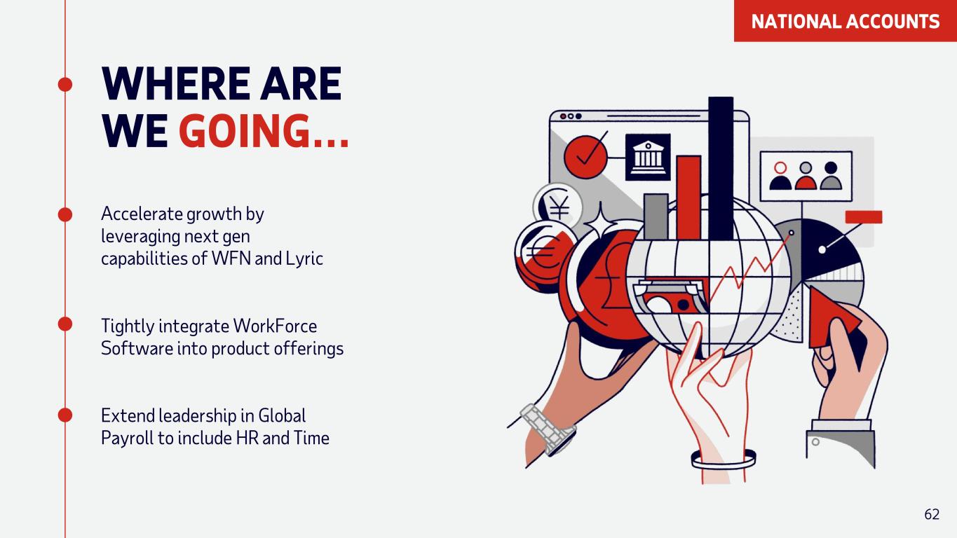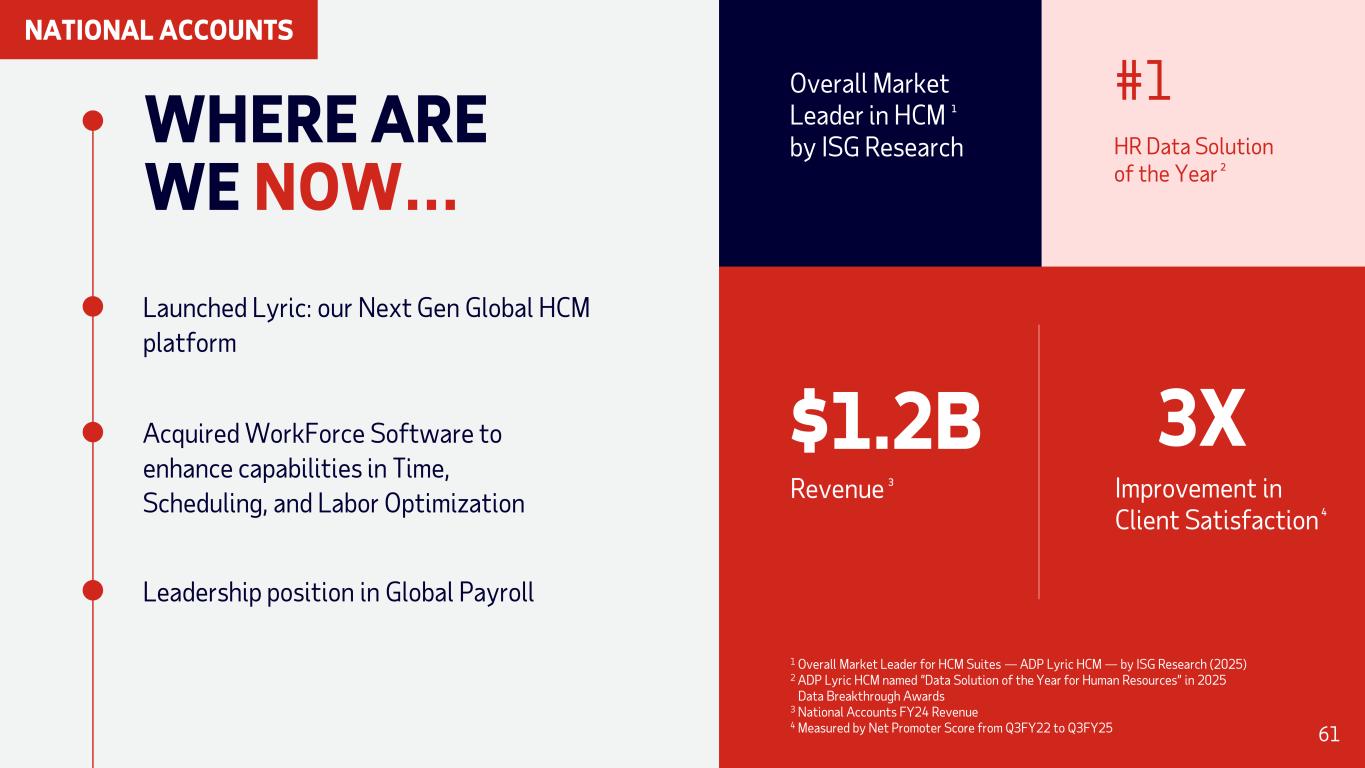 WHERE ARE WE NOW… Launched Lyric: our Next Gen Global HCM platform Acquired WorkForce Software to enhance capabilities in Time, Scheduling, and Labor Optimization Leadership position in Global Payroll Overall Market Leader in HCM by ISG Research 1 #1 HR Data Solution of the Year 2 $1.2B 3X Improvement in Client Satisfaction Revenue 3 4 1 Overall Market Leader for HCM Suites — ADP Lyric HCM — by ISG Research (2025) 2 ADP Lyric HCM named “Data Solution of the Year for Human Resources” in 2025 Data Breakthrough Awards 3 National Accounts FY24 Revenue 4 Measured by Net Promoter Score from Q3FY22 to Q3FY25 61 NATIONAL ACCOUNTS