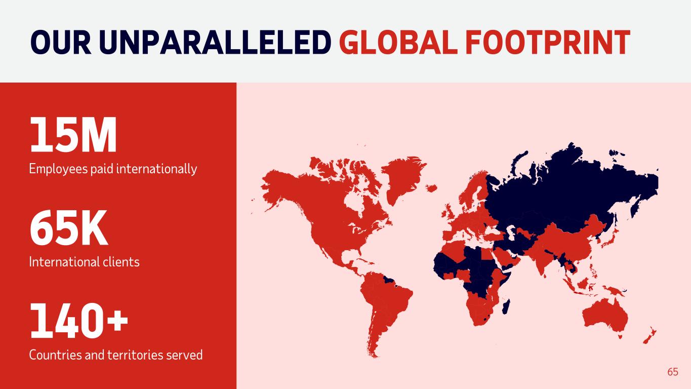 15M Employees paid internationally OUR UNPARALLELED GLOBAL FOOTPRINT 65K International clients 140+ Countries and territories served 65