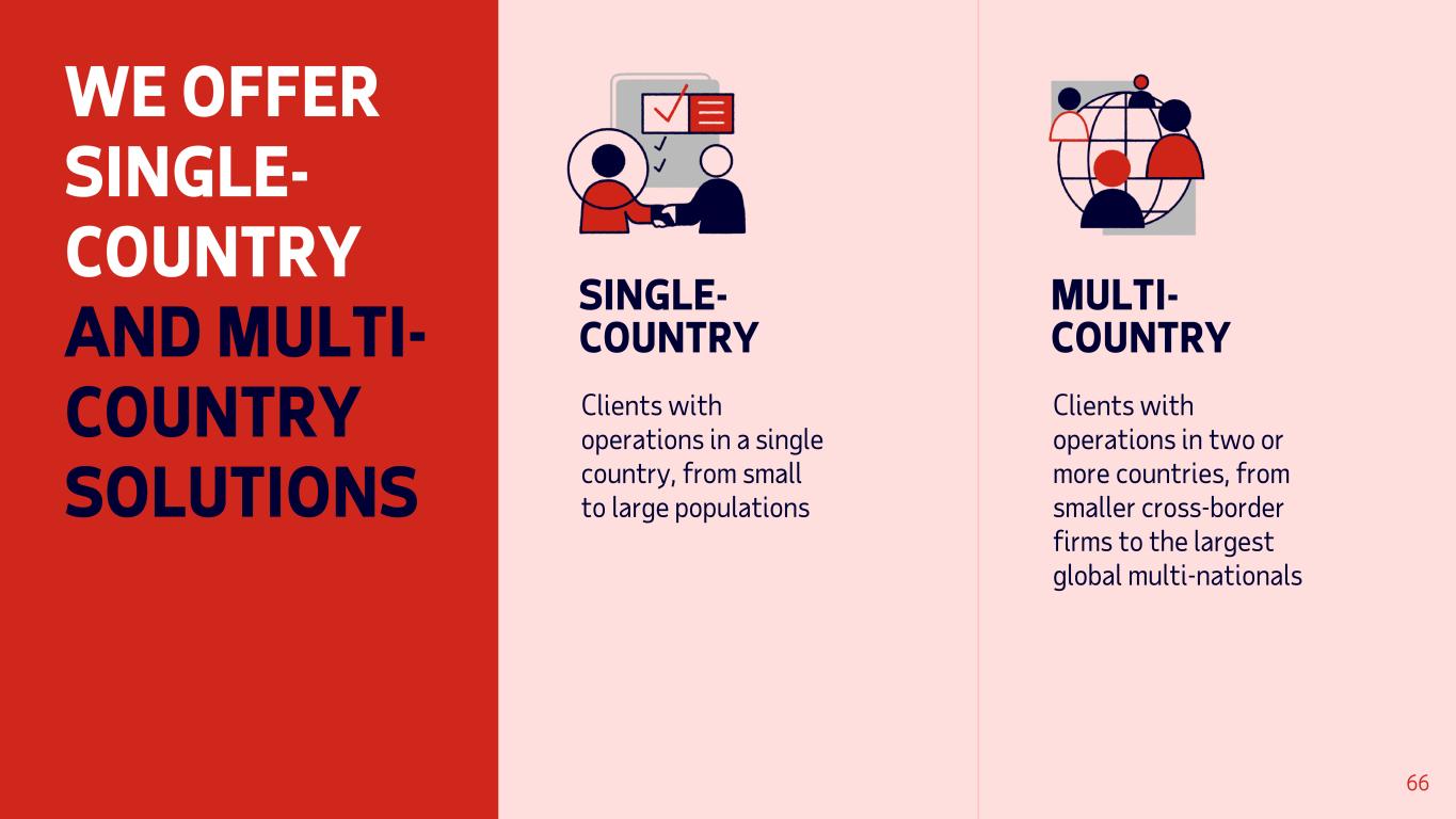 WE OFFER SINGLE- COUNTRY AND MULTI- COUNTRY SOLUTIONS MULTI- COUNTRY Clients with operations in two or more countries, from smaller cross-border firms to the largest global multi-nationals SINGLE- COUNTRY Clients with operations in a single country, from small to large populations 66