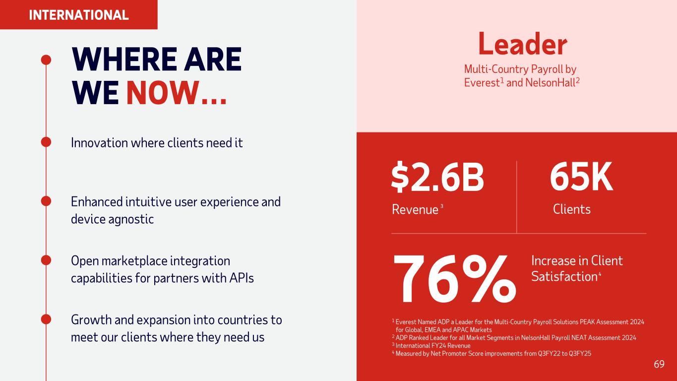 WHERE ARE WE NOW… Innovation where clients need it Enhanced intuitive user experience and device agnostic Open marketplace integration capabilities for partners with APIs Clients 65K Revenue $2.6B Increase in Client Satisfaction76% 1 Everest Named ADP a Leader for the Multi-Country Payroll Solutions PEAK Assessment 2024 for Global, EMEA and APAC Markets 2 ADP Ranked Leader for all Market Segments in NelsonHall Payroll NEAT Assessment 2024 3 International FY24 Revenue 4 Measured by Net Promoter Score improvements from Q3FY22 to Q3FY25 3 4 Growth and expansion into countries to meet our clients where they need us Leader Multi-Country Payroll by Everest1 and NelsonHall2 69 INTERNATIONAL