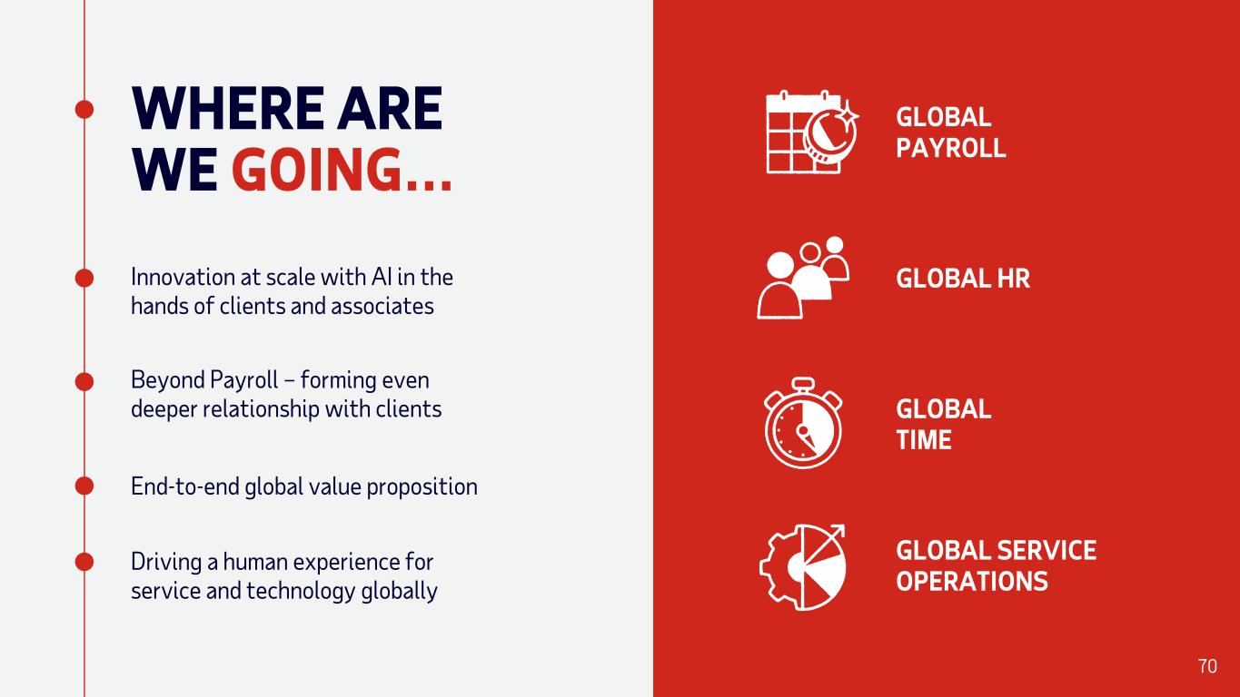 End-to-end global value proposition Beyond Payroll – forming even deeper relationship with clients Innovation at scale with AI in the hands of clients and associates WHERE ARE WE GOING… Driving a human experience for service and technology globally GLOBAL HR GLOBAL PAYROLL GLOBAL TIME GLOBAL SERVICE OPERATIONS 70