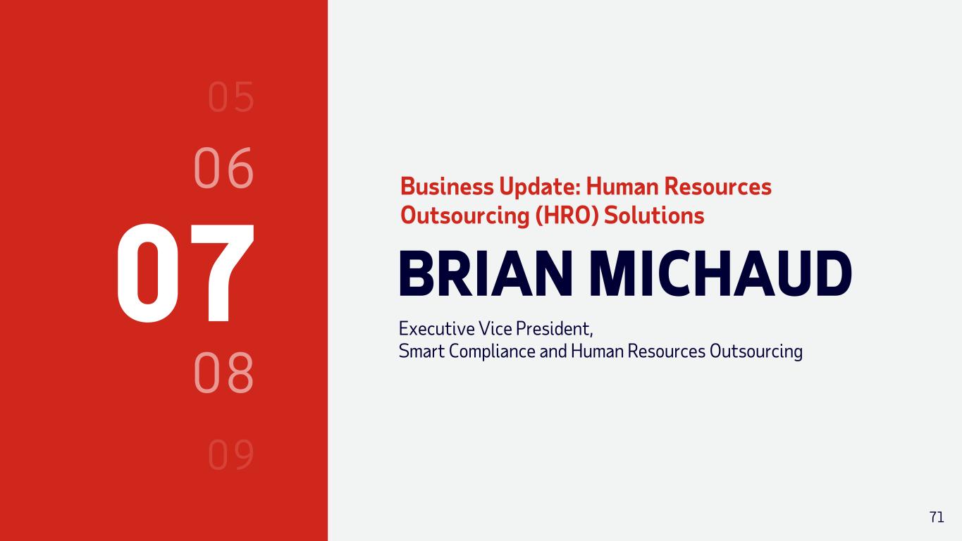 07 BRIAN MICHAUD Executive Vice President, Smart Compliance and Human Resources Outsourcing Business Update: Human Resources Outsourcing (HRO) Solutions 71