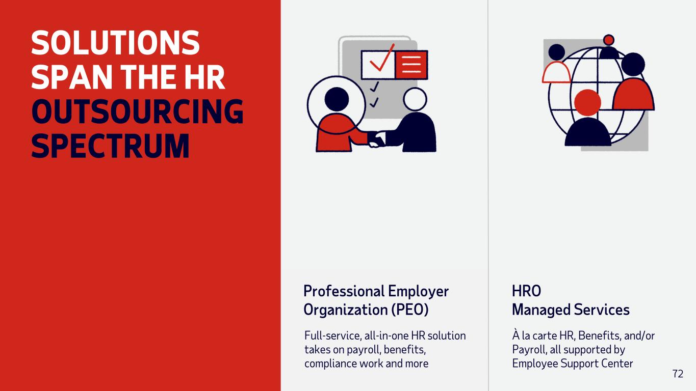 SOLUTIONS SPAN THE HR OUTSOURCING SPECTRUM À la carte HR, Benefits, and/or Payroll, all supported by Employee Support Center HRO Managed Services Full-service, all-in-one HR solution takes on payroll, benefits, compliance work and more Professional Employer Organization (PEO) 72