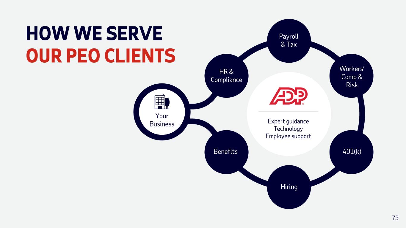 HOW WE SERVE OUR PEO CLIENTS Expert guidance Technology Employee support Payroll & Tax Workers’ Comp & Risk 401(k) Hiring Benefits HR & Compliance Your Business 73