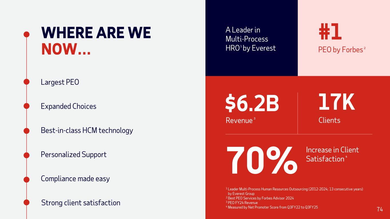 Clients 17K Revenue $6.2B Increase in Client Satisfaction70% 1 Leader Multi-Process Human Resources Outsourcing (2012-2024; 13 consecutive years) by Everest Group 2 Best PEO Services by Forbes Advisor 2024 3 PEO FY24 Revenue 4 Measured by Net Promoter Score from Q3FY22 to Q3FY25 3 4 #1 PEO by Forbes 2 WHERE ARE WE NOW… Largest PEO Expanded Choices Best-in-class HCM technology A Leader in Multi-Process HRO by Everest1 74 Personalized Support Compliance made easy Strong client satisfaction