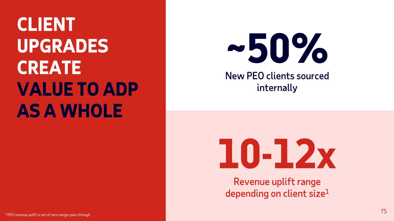 New PEO clients sourced internally ~50% Revenue uplift range depending on client size1 10-12x CLIENT UPGRADES CREATE VALUE TO ADP AS A WHOLE 75 1 PEO revenue uplift is net of zero margin pass-through